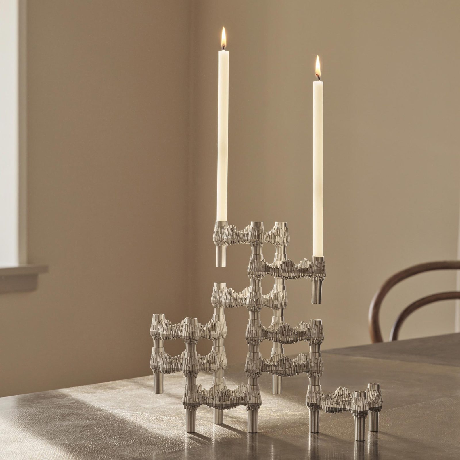 Available today in finishes such as brushed chrome, the Quist candle holder has been reissued by STOFF Copenhagen with respect to its 1970s origins. At just over 2.3″ tall (5.9 cm) and 4″ in diameter (10 cm), it’s compact in size yet expansive in possibility.