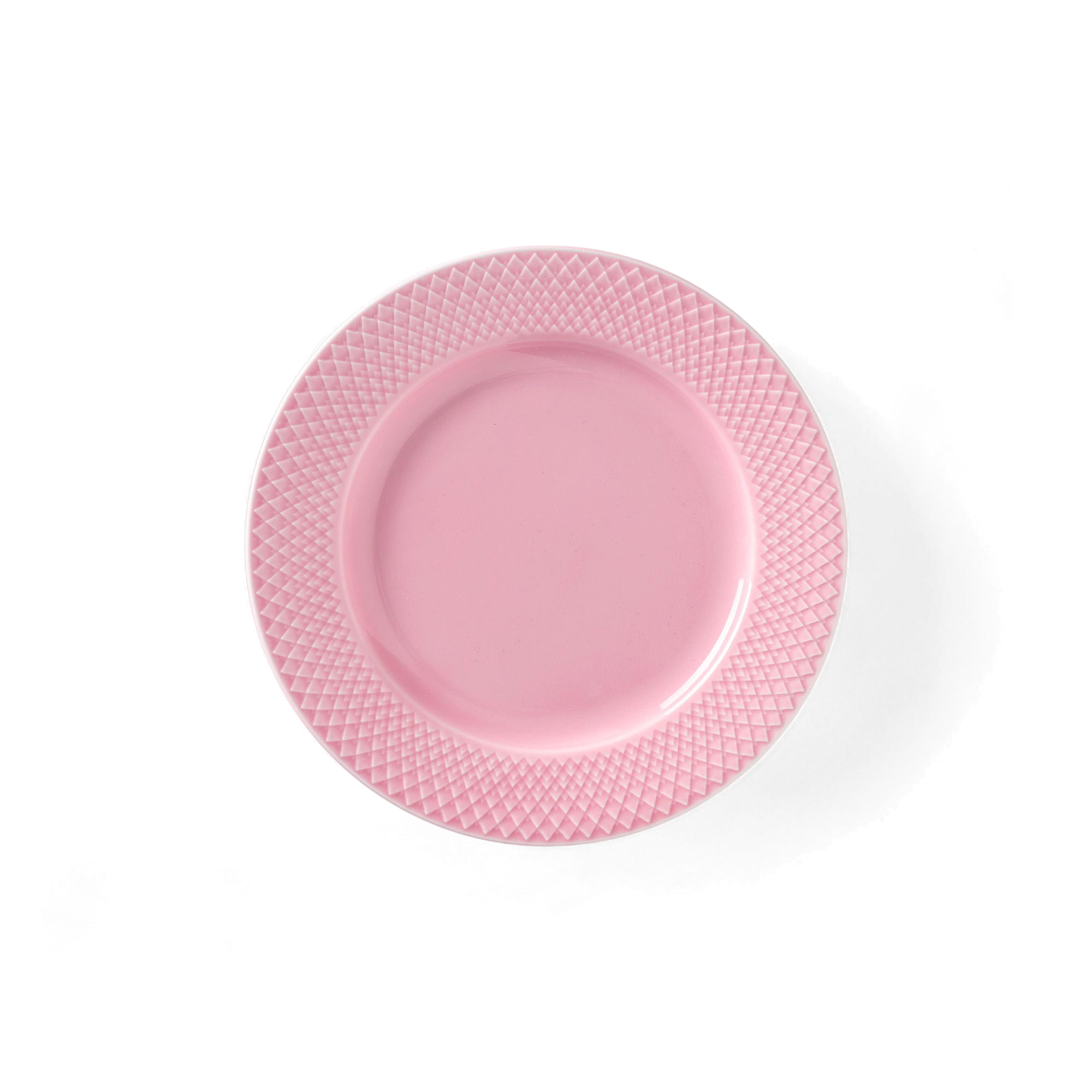 The Rhombe Color lunch plate keeps Lyngby Porcelæn’s archive pattern on the rim and leaves the center clear for food. The raised rhombus relief catches light under a transparent glaze; the geometry reads, the plate stays quiet. At 8.3″ across, it’s the right everyday size for a sandwich, small salad, or cake. Developed with Copenhagen studio Stilleben, it’s made to mix—use a single shade with white Rhombe for a calm setting, or combine colors and let the motif hold it together. Glazed porcelain, dishwasher and microwave safe. Available in Rose or Green.