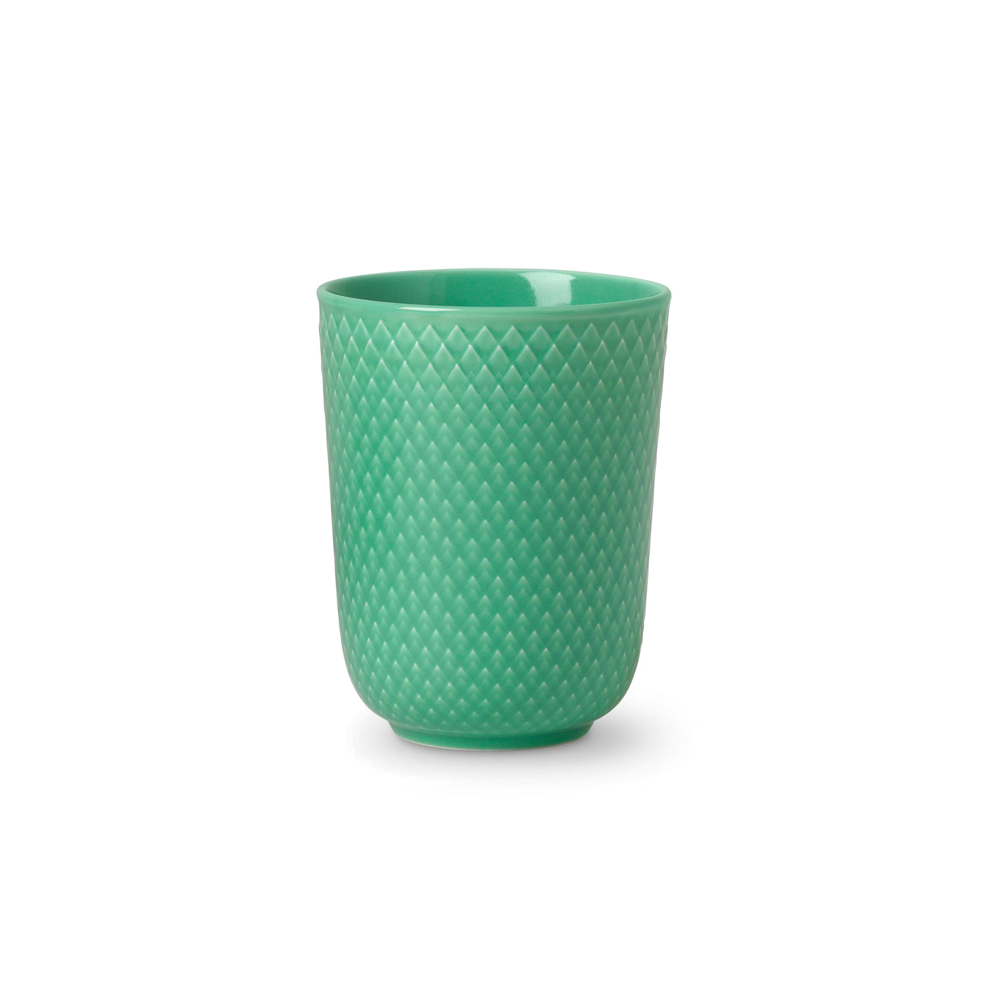 This handleless porcelain mug carries the Rhombe relief from Lyngby Porcelæn’s archive—an elegant diamond pattern first introduced in 1961 and reinterpreted for the present by Stilleben v/Reckweg. The raised geometry adds a light, tactile grip and a quiet play of shadow around the cup, making it a natural companion to the original white Rhombe pieces as well as the rest of the Color series.