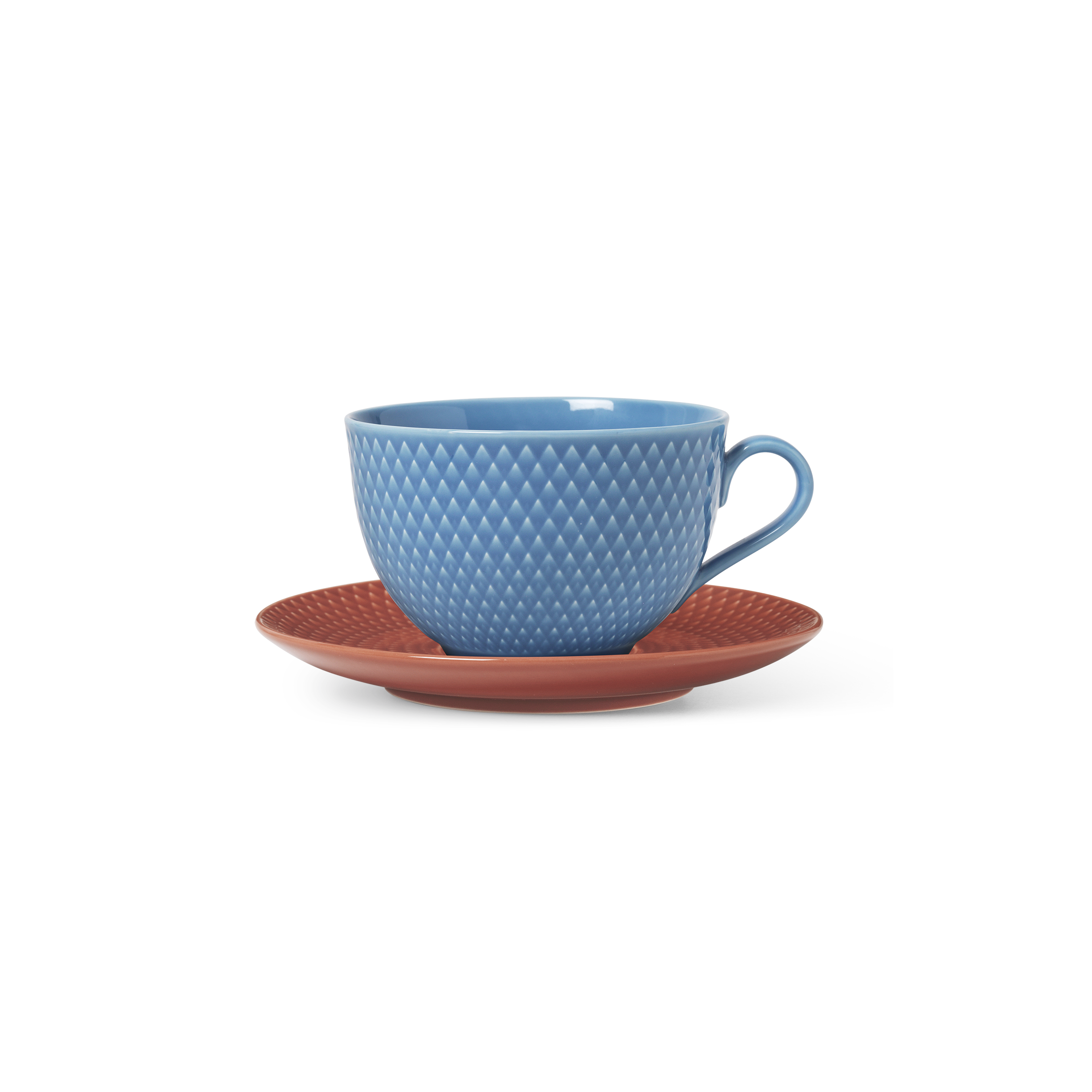 The Rhombe Color tea cup and saucer pair brings Lyngby Porcelæn’s archive relief to a small daily ritual. The cup’s rhombus texture gives a light grip while the lip stays thin for an easy sip; the handle sits high so fingers clear the body. The saucer mirrors the geometry with a shallow well that centers the cup and catches stray drips—also handy for a biscuit. Two ready-made duos keep the mix-and-match idea simple: Blue cup with Terracotta saucer or Rose cup with Sand saucer. Use them with white Rhombe for a calm table, or rotate colors across settings and let the pattern tie everything together. Glazed porcelain; dishwasher and microwave safe.