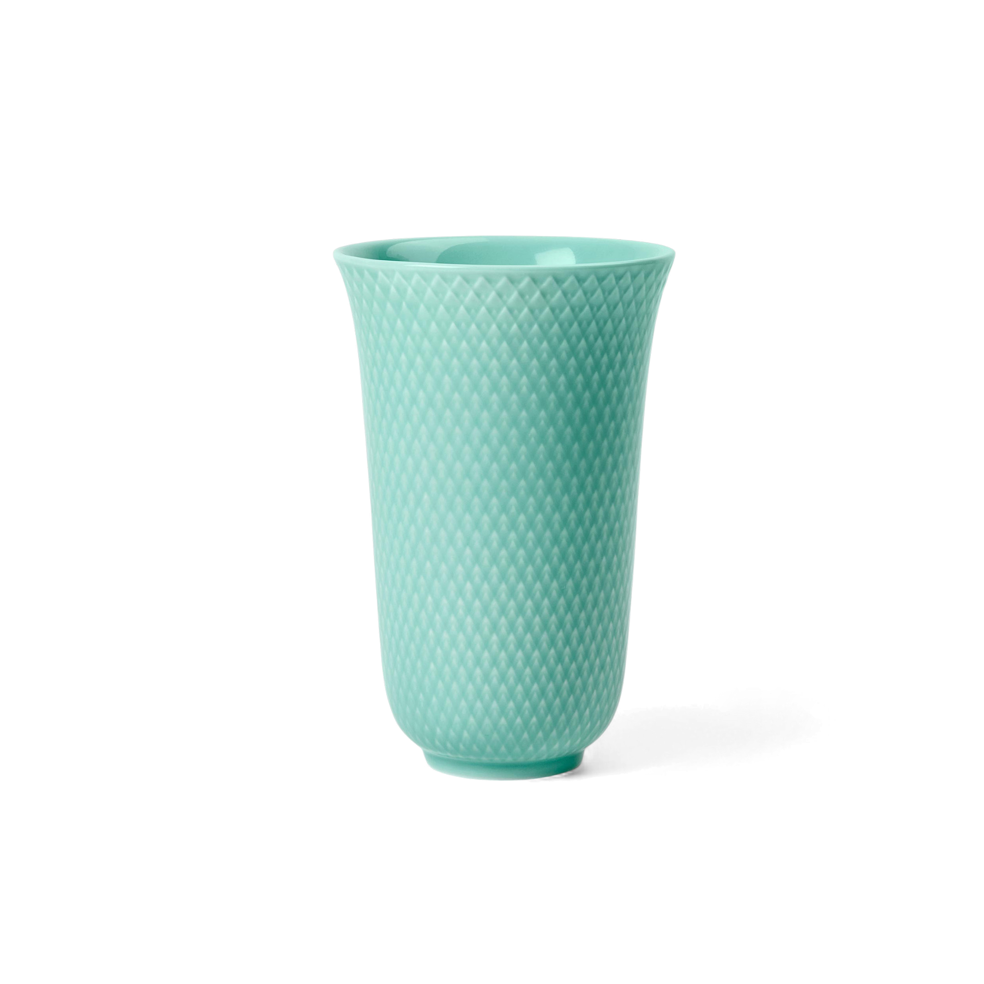 Straight body, slight flare at the rim—more tulip than cylinder. Drop a few stems in and they find their own stance. A transparent glaze lets the Rhombe relief read through the surface; under window light the geometry shows up like a soft grid. Developed with Stilleben, it lands firmly in the Rhombe family without feeling formal.