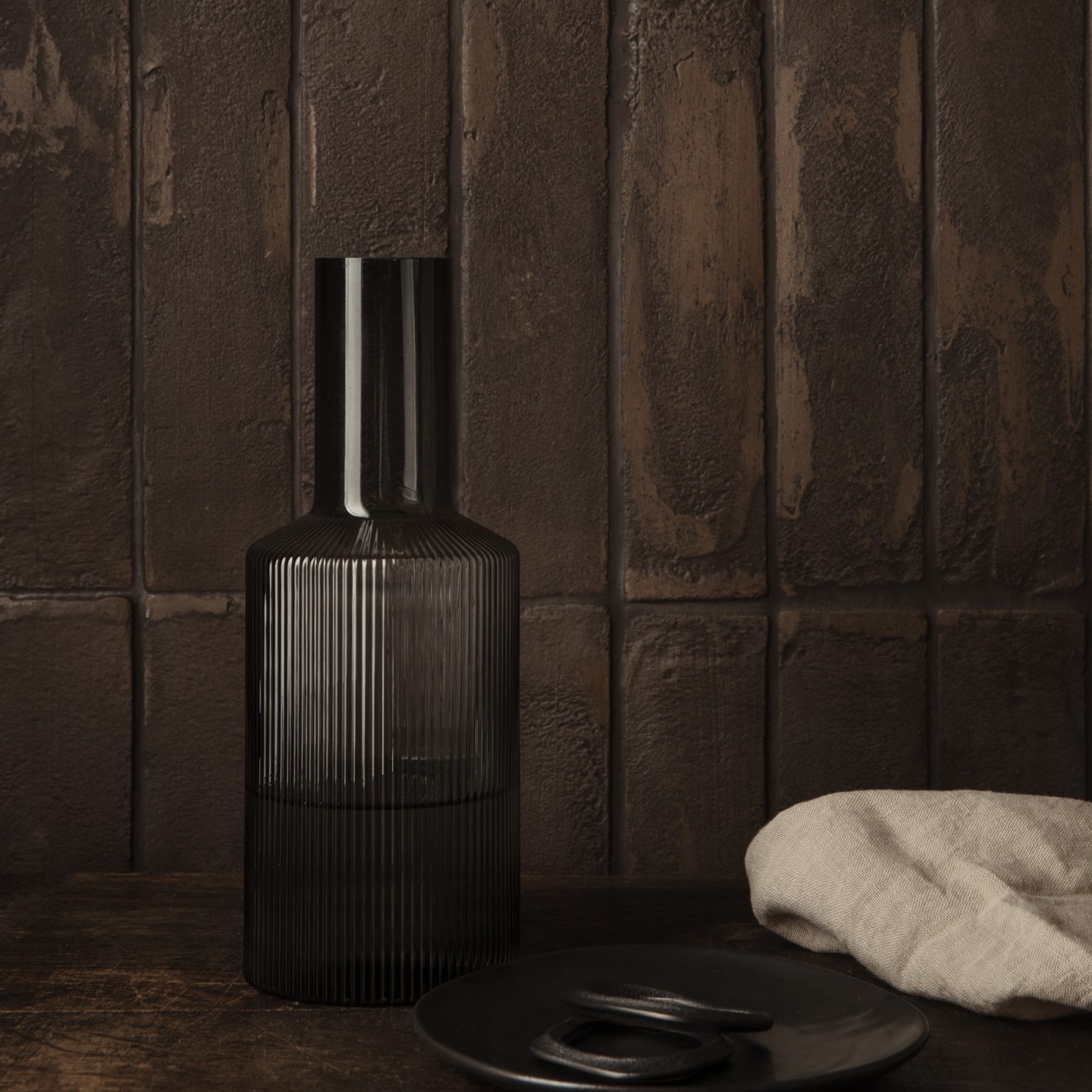 Crafted by being mouth-blown into the mold, this functional yet elegant carafe is made of tinted or clear glass and adorned with a rippled design, lending it a modern aesthetic. Ideal for holding water, juice, or any beverage of your choice, it pairs seamlessly with its matching set of glasses, offering a chic and coordinated way to serve drinks.