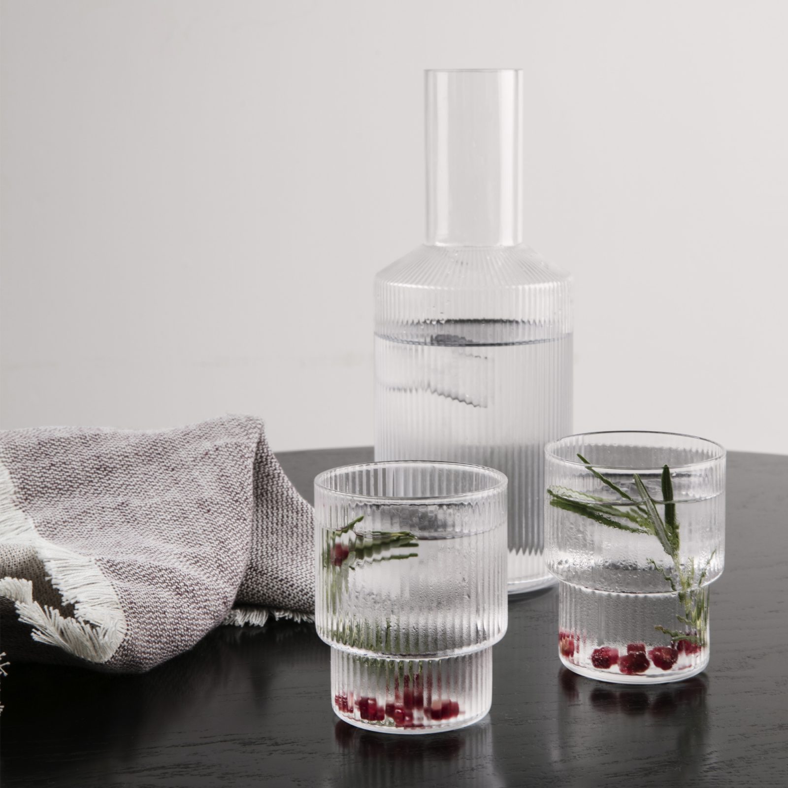 Each glass in this set of four, mouth-blown into its mold, showcases a stunning rippled surface on clear or tinted glass. The vertical ripples contribute a sense of strength and sophistication, while their varied geometric shapes not only create a dynamic interplay between the glasses but also allow for stackable functionality. These glasses, ideal for breakfast, lunch, or dinner, pair seamlessly with the matching carafe for a cohesive and stylish set. Additionally, a clear glass version of this set is available, offering another elegant option.