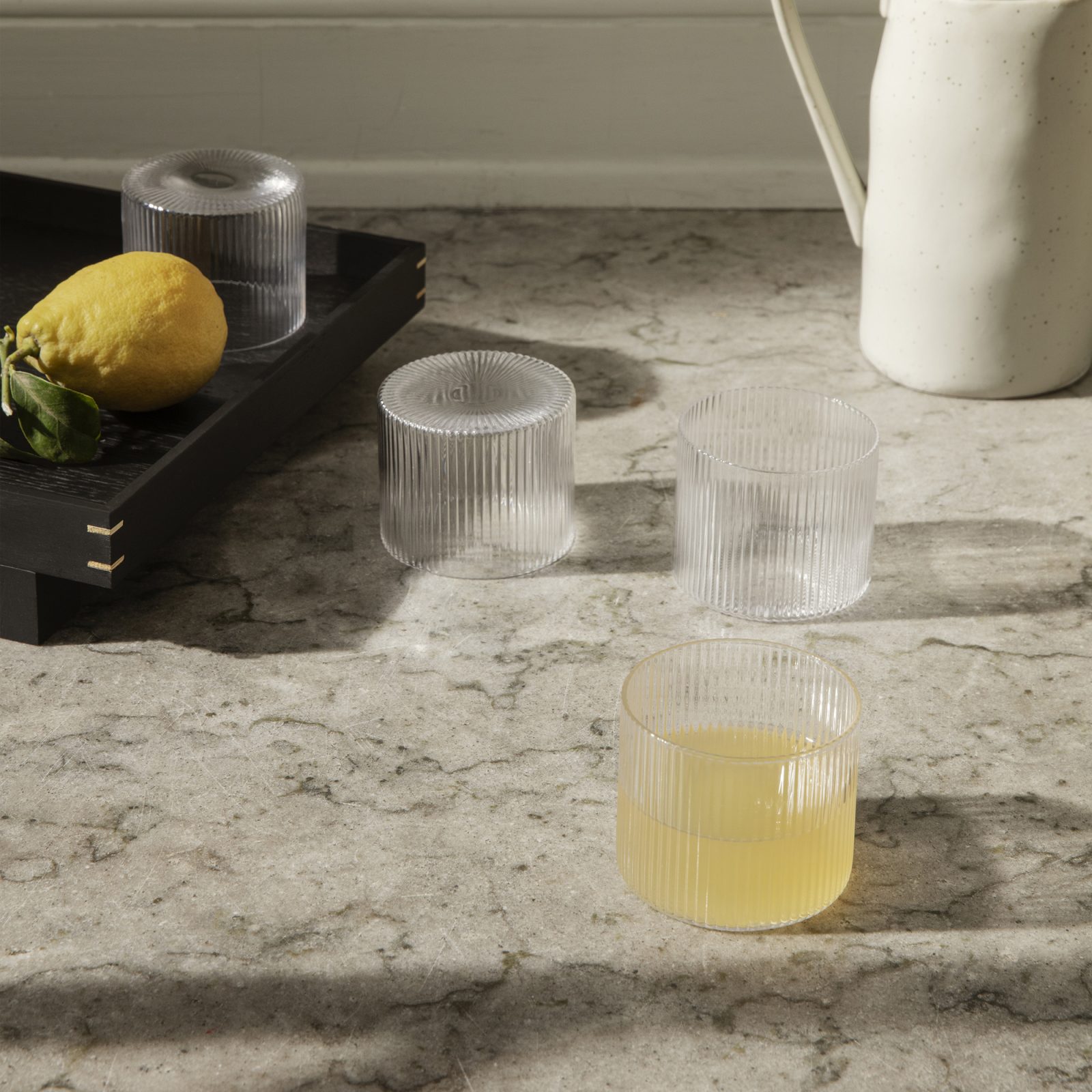 Handcrafted through mouth-blowing into their molds, these four low glasses exhibit an eye-catching rippled texture. Their design, featuring pronounced vertical lines, lends a sophisticated and strong aesthetic to their otherwise simple and timeless shape. They are well-suited for informal meals and can be beautifully matched with additional pieces from the Ripple glass collection to create a harmonious table setting.