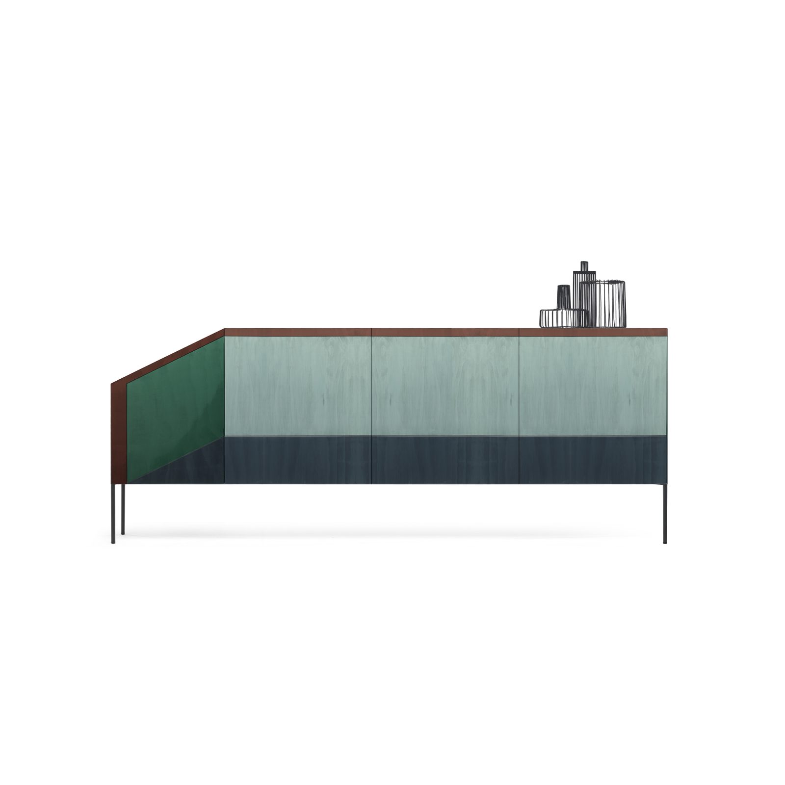 Ritratti designed by Dainelli Studio is a series of cabinets made of mdf veneered with mixed finish lacquered toulipier wood. A sideboard version is also available with 4 doors and 4 internal shelves, while the cabinet version has 2 doors and 4 internal shelves. Ritratti is an atipical storage, with an asymmetric shape accentuaded by the corner cut. The cabinet features sharp lines and strong colors that resemble a perpective view. Ritratti is available in 2 color combinations, in warm and cold tones.