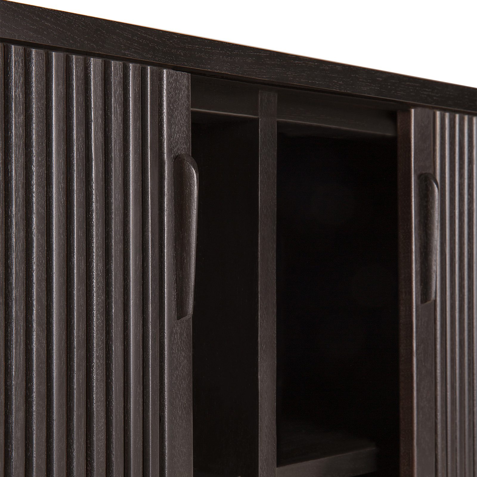 A storage piece that doesn’t just sit quietly in the background. The Roller Max Sideboard, designed by Alain van Havre, makes a visual statement with its textured surface of stacked wooden slats—an architectural detail that invites a second look. Available in two lengths—66″ and 88″—this sideboard offers generous storage behind sliding doors, complete with adjustable shelving and subtly integrated handles that keep the profile clean.