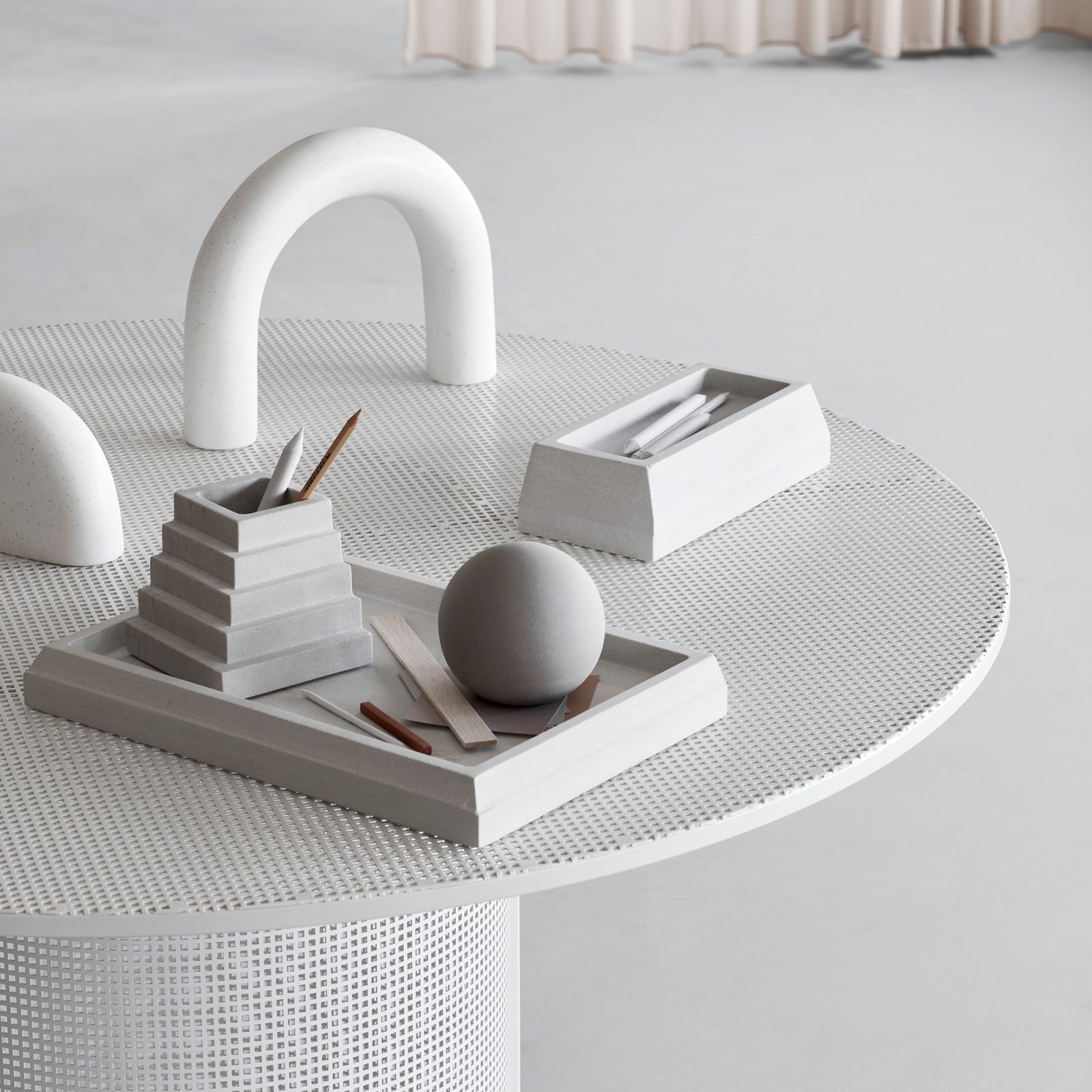 The Small Sandstone Desk Organizer is designed for practical use in any workspace. Made from light grey sandstone, it offers a matte finish and a pyramid-like shape. This organizer is suitable for storing small items like pens and pencils. Its design is inspired by traditional architecture, and the neutral color and simple shape make it adaptable to various office styles.