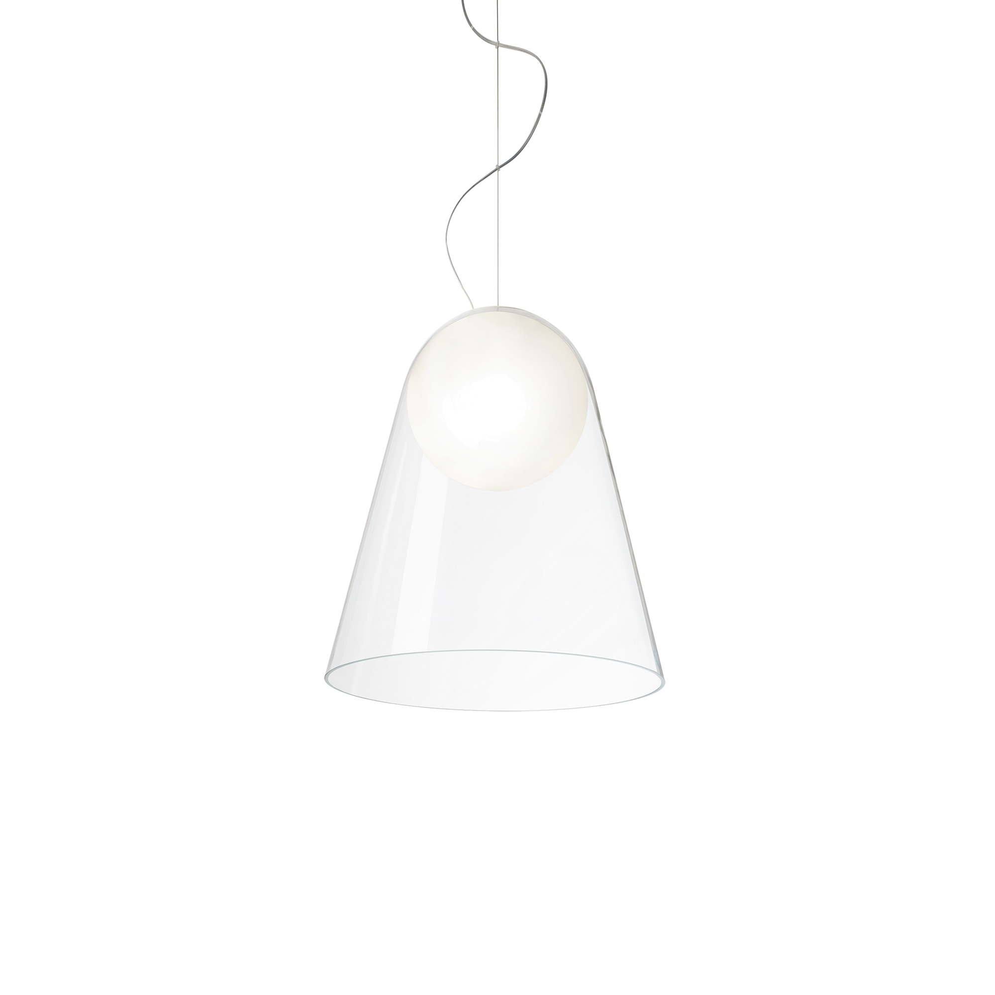 A single, taper-sided bell of crystal-clear, hand-blown glass drifts from an almost invisible cable; inside it, a satin-white globe seems to pause in mid-fall. That is the quiet trick of Eugeni Quitllet’s Satellight. Because the cone and sphere never touch, light feels as if it’s radiating from nowhere—soft enough for evening meals, bright enough for a hallway, always free of glare. The LED module hidden in the “moon” glows at a warm 2700 K (CRI 90), dims smoothly on standard TRIAC or ELV controls, and lasts for years without a bulb change. All the supporting hardware—slender steel suspension, transparent power cord, glossy white canopy—recedes so the eye stays on the floating forms. Hang one over a café table, stagger three down a stairwell, or use the optional decentralization kit to let the cone wander off-axis; in every scenario Satellight brings a moment of weightless calm, equal parts design object and quiet night-sky poetry.