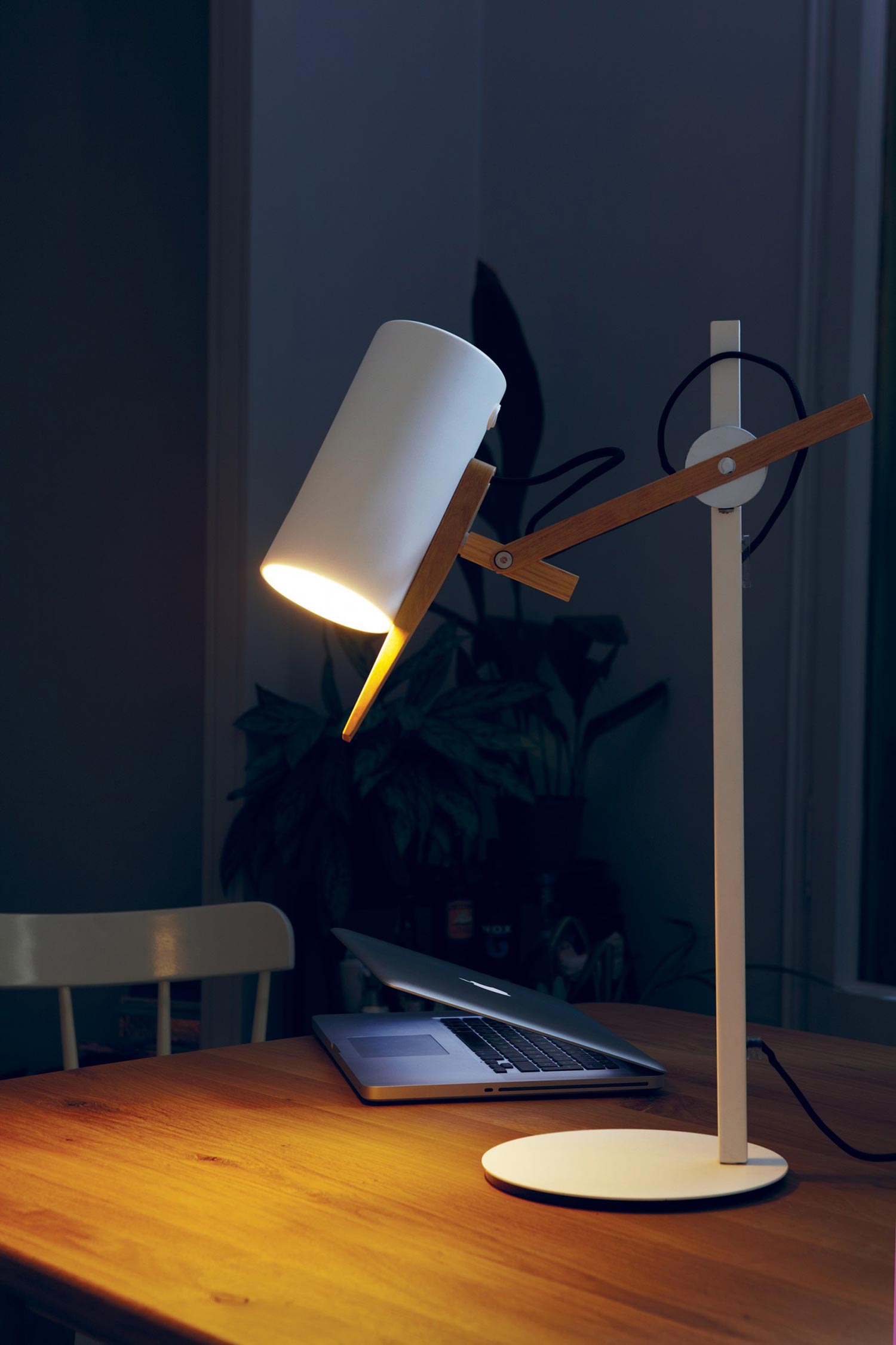 A combination of basic geometric shapes and the use of wood together with metal give this range of lamps a homely appearance, at the same time as a clearly defined personality. All of the movements of the fully rotating shade use arms and hinges, and its technical precision means that springs or counterweights are not necessary in order to maintain the selected position. Scantling is a term used to define the size to which a piece of wood or stone is measured and cut, derived from the name of an old unit of measurement. The interplay of the different elements used in its design gives this lamp an archetypal, almost graphic appearance.