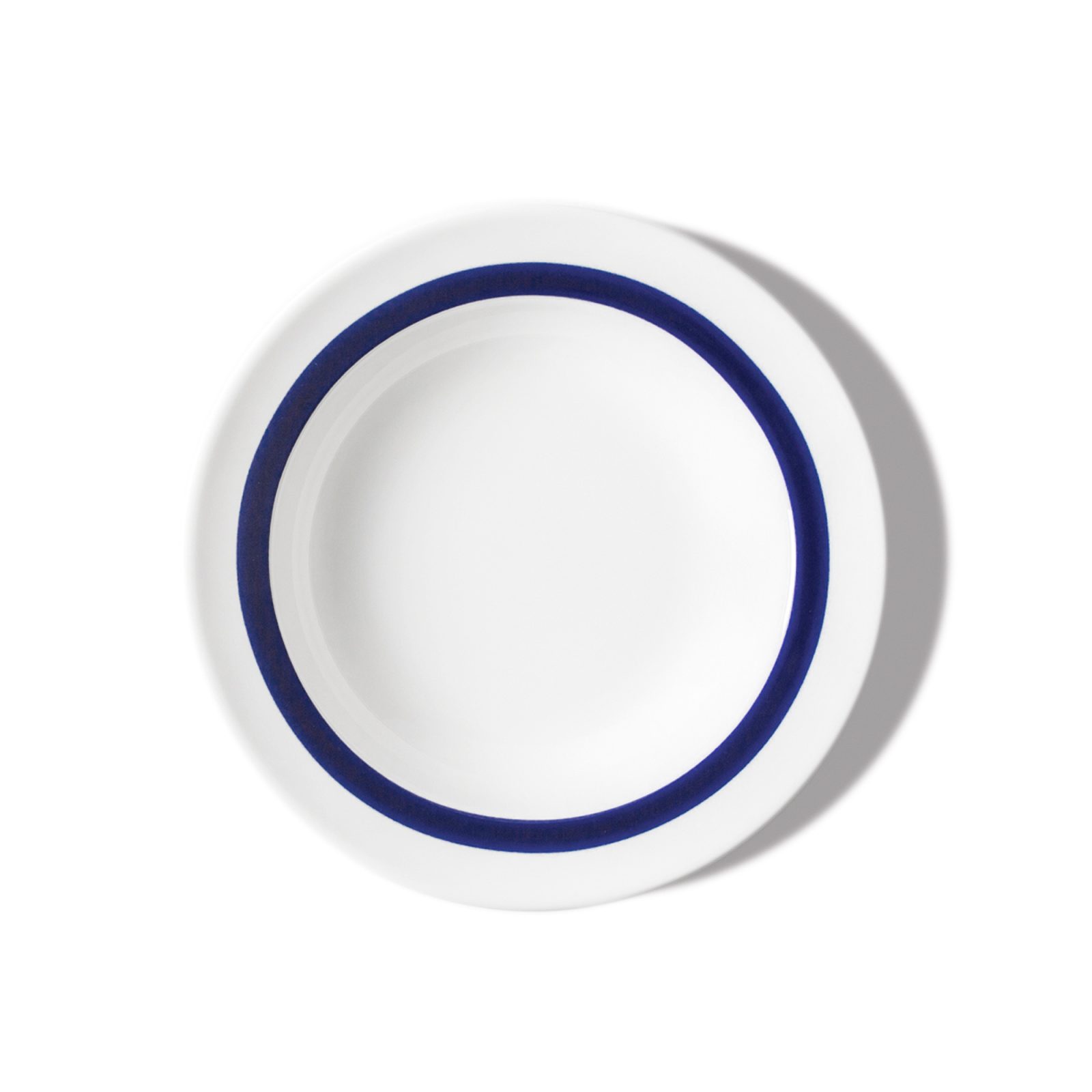 The crosshatch plate lays a quiet grid beneath the stack; the dinner plate carries a deep painted ring that frames every dish; the bowl repeats that band inside its well, tightening the composition. Look closely and you’ll catch the slight wavering at the turn of the rim—like a favorite market find, but crisp enough for daily use. Blue stays disciplined against bright white, giving the setting a calm, graphic rhythm.