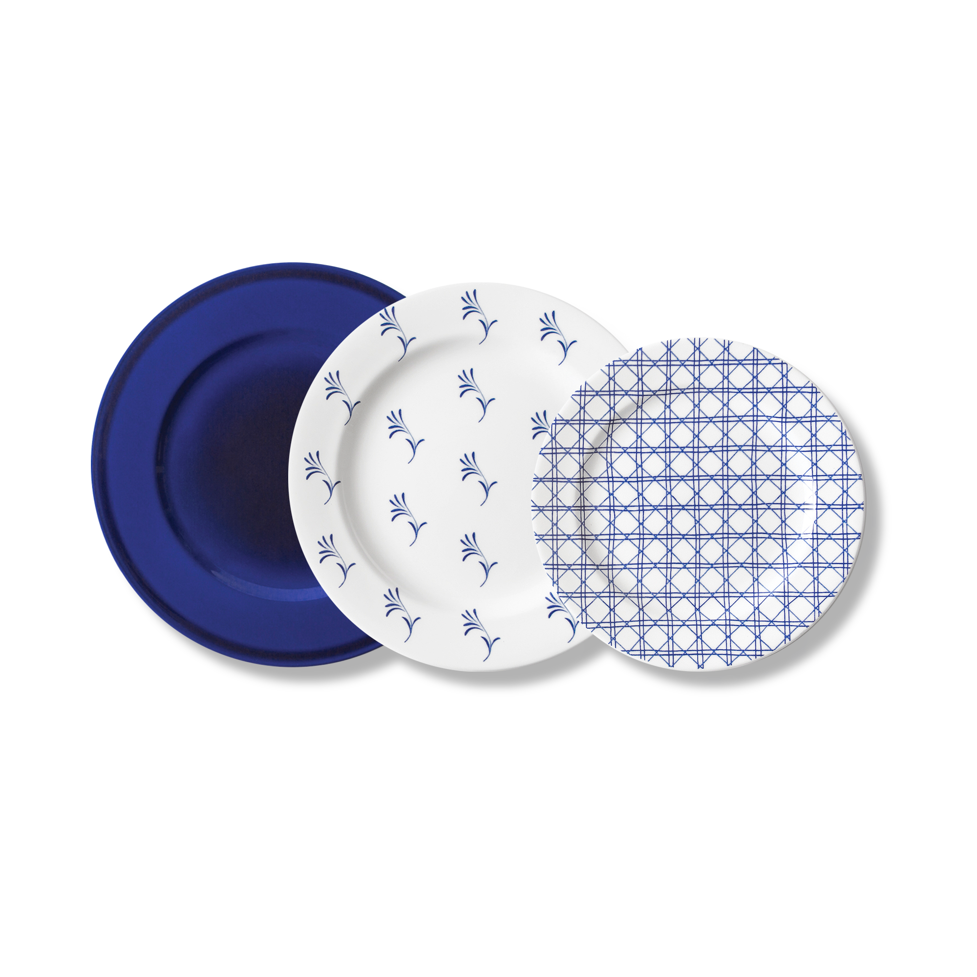 This setting reads collected, not matching: a solid midnight plate anchors the stack; the next scatters small sprigs in an easy, hand-drawn rhythm; the third lays down a crisp lattice of dots and lines. The contrast is part graphic, part memory—white rims catch evening light, the navy base gives everything a calm horizon.