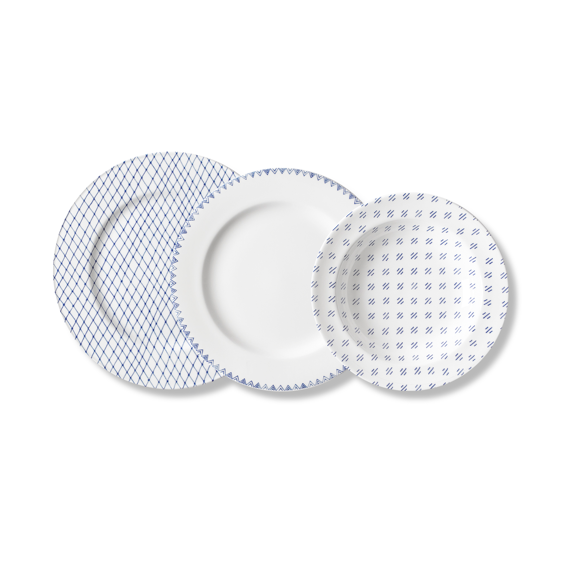 Shabbychic Dinner Set No. 6 by Piero Lissoni—a Gessato-curated trio of blue-on-white patterns: diamond crosshatch, zigzag rim, and a dash-print bowl. Lissoni’s take on shabby chic leans into “controlled imperfection,” the hand-drawn wobble that makes a stack feel collected.