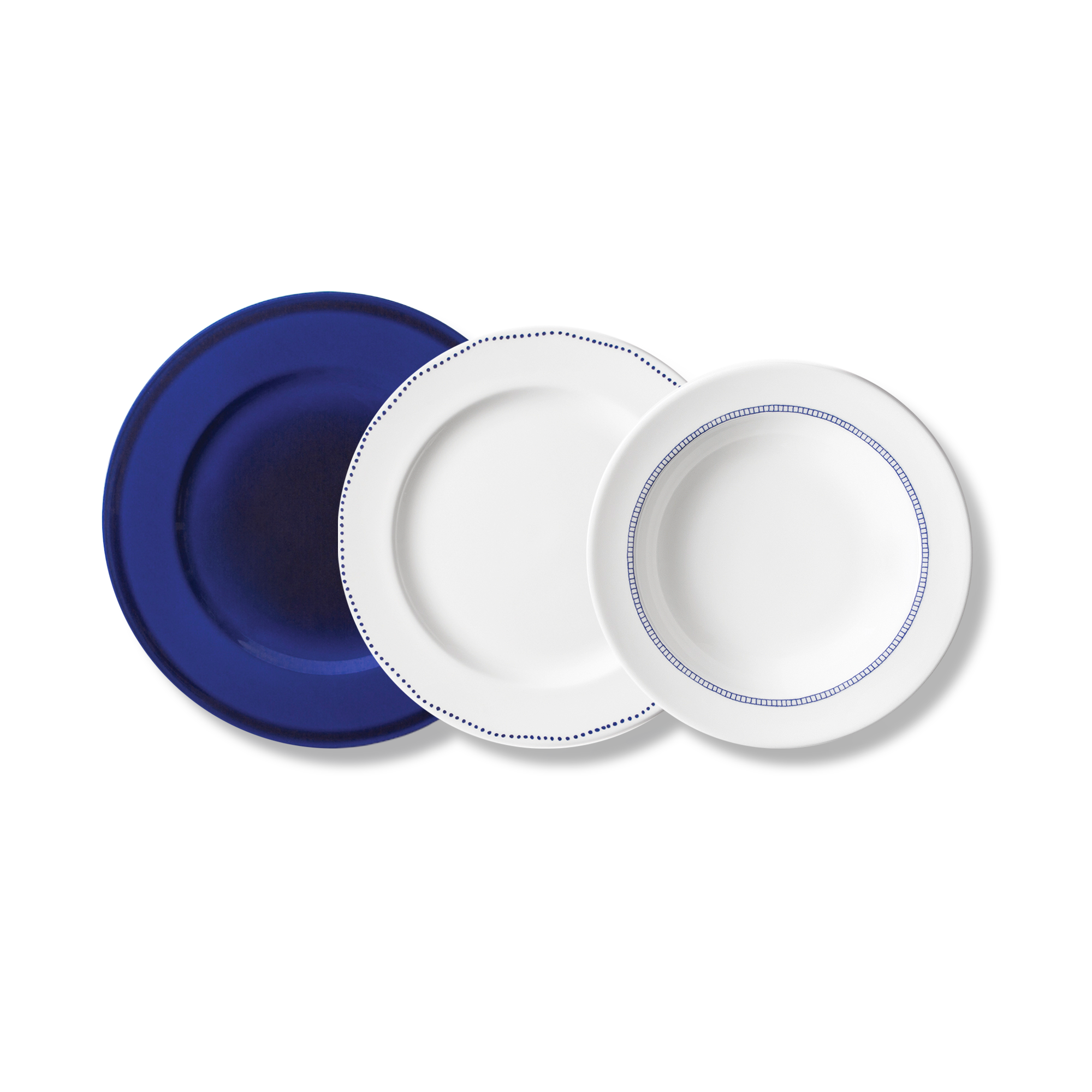Shabbychic Dinner Set No. 7 by Piero Lissoni—a Gessato-curated trio: deep navy base, a white dinner plate with a scalloped dot rim, and a bowl ringed in cobalt. Lissoni’s Shabbychic idea favors “controlled imperfection,” the kind of graphic wobble you’d keep from a lucky flea-market find.