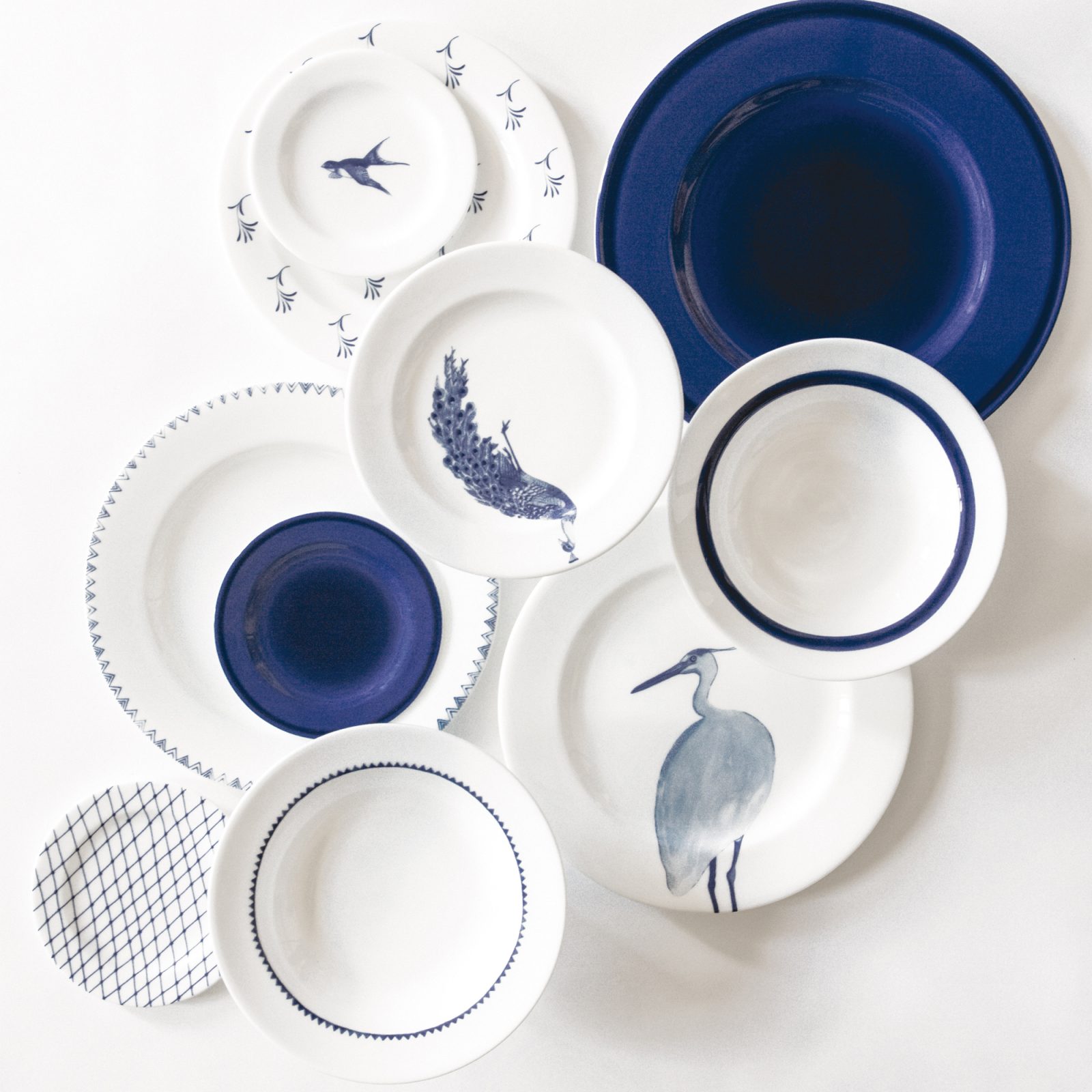 Shabbychic Dinner Set No. 8 by Piero Lissoni—a Gessato-curated trio: navy base, a white dinner plate with tiny cobalt tick marks at the rim, and a bowl printed all over with diagonal dashes. Lissoni’s shabby-chic idea is about controlled imperfection—the gentle wobble of a painted line, the feel of something found and kept.