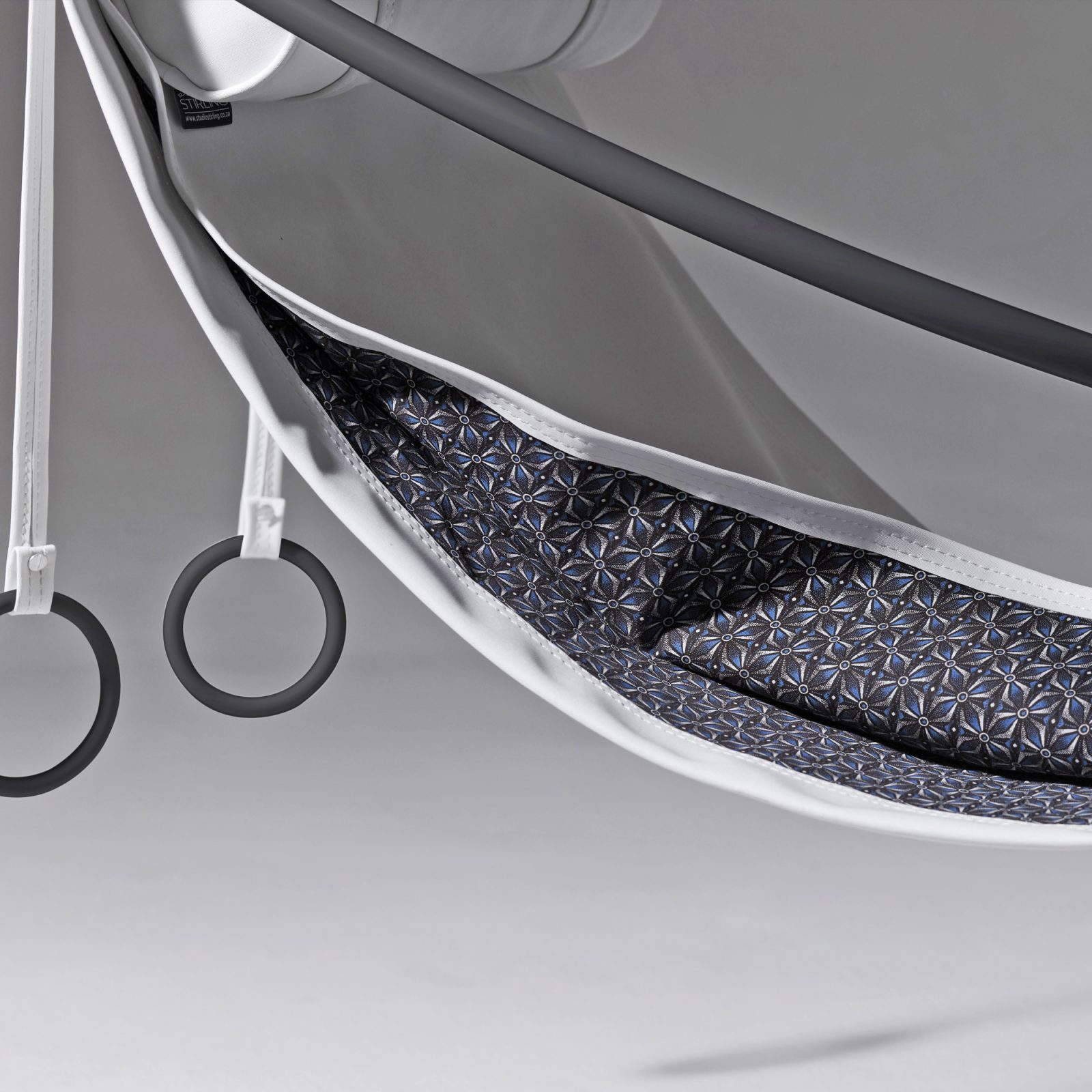 Take a moment to unwind with the Sling Outdoor lounge chair. Featuring Studio Stirling’s popular Sling design, this outdoor version transforms any garden or terrace into your favorite relaxation space. The hanging chair boasts a circular frame made from powder-coated stainless steel and a seat made from a Spradling Silvertex material. This textile is vegan, sustainable and environmentally-friendly as well as resistant to the elements. Each chair is handmade in South Africa by master craftspeople. Sling comes with the included installation mechanism and a bolster that enhances comfort further.