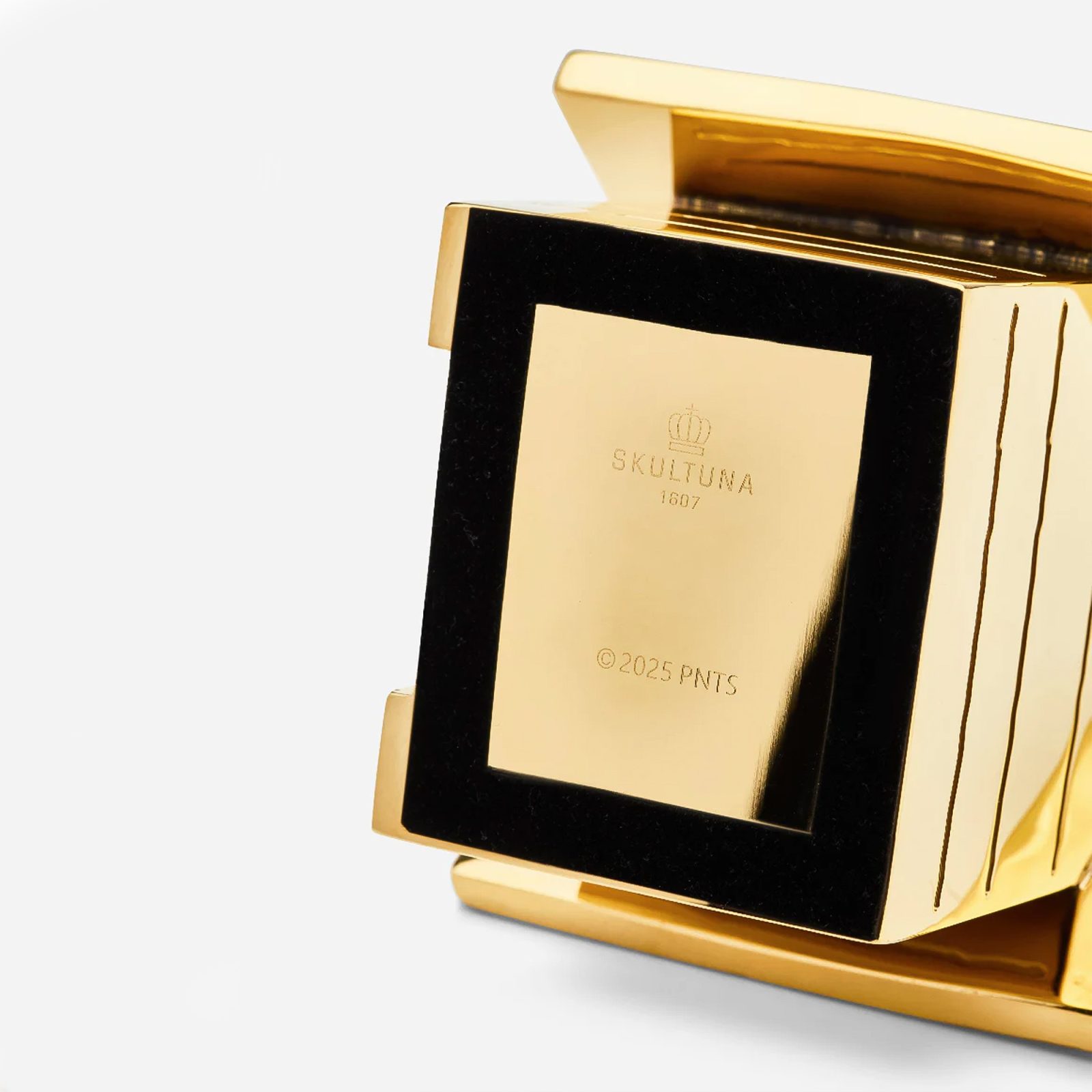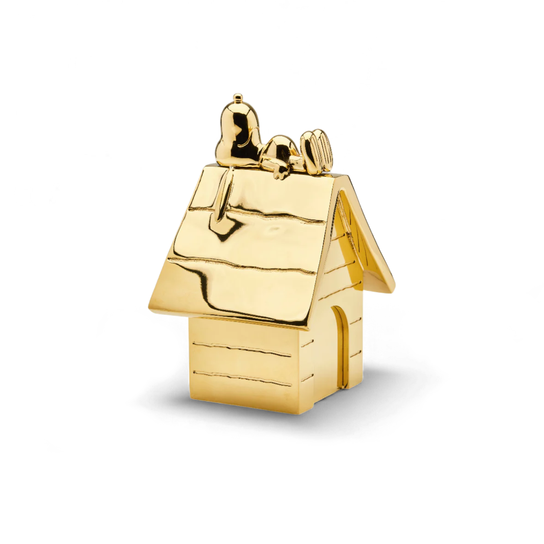 Snoopy on the Roof is part of Skultuna’s Peanuts collaboration, produced as a small sculptural object in gold-plated stainless steel. The piece depicts Snoopy resting on his doghouse, rendered as a single solid form with simplified details and a polished surface.