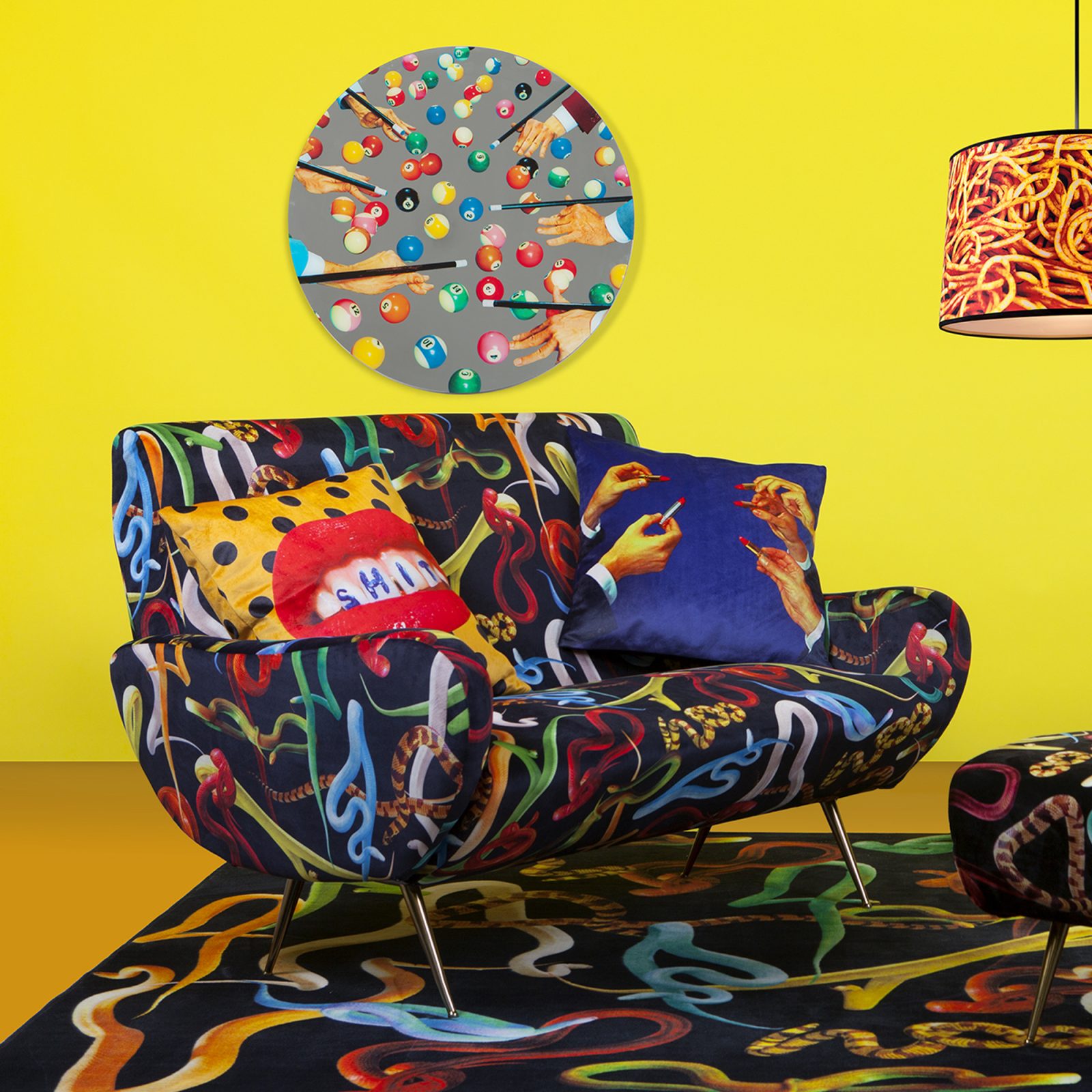 Your home should express your own creative spirit and love of artistic designs. The Seletti Sofa from the Toiletpaper collection is a perfect choice. Each design features a tongue in cheek image from the archive of photo-based publication Toiletpaper Magazine. Printed with a special technique on a quality fabric, the image is brightly colored and sharply detailed to create a focal point effortlessly. Apart from its bold appearance, the sofa is also made with a blend of high-quality materials. These include a wooden frame, brass legs, and a soft polyurethane padding for extra comfort. This Seletti Sofa is made in Italy. Complement this design with the other products from the Seletti Wears Toiletpaper collection.