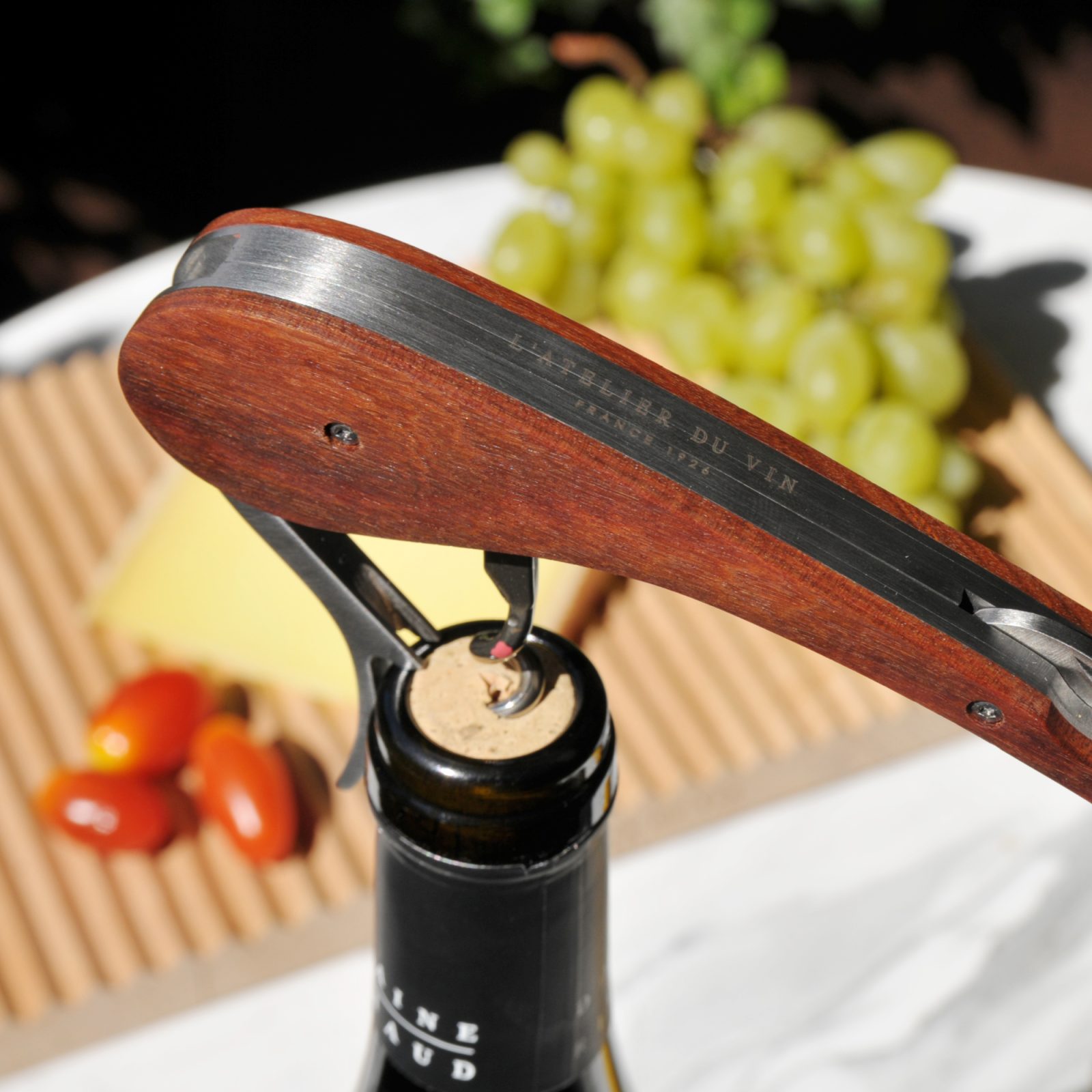 The mechanism is a rack-and-pinion system that pulls the cork straight up in one continuous lift. Use the small foil-cutting wheel built into the handle, set the support arm on the bottle neck, twist until you reach the marker, then lift—clean release, no wrestling. It also includes a bottle opener, comes in a matte black gift box with a protective sleeve, and can be personalized if you want the gift to land.