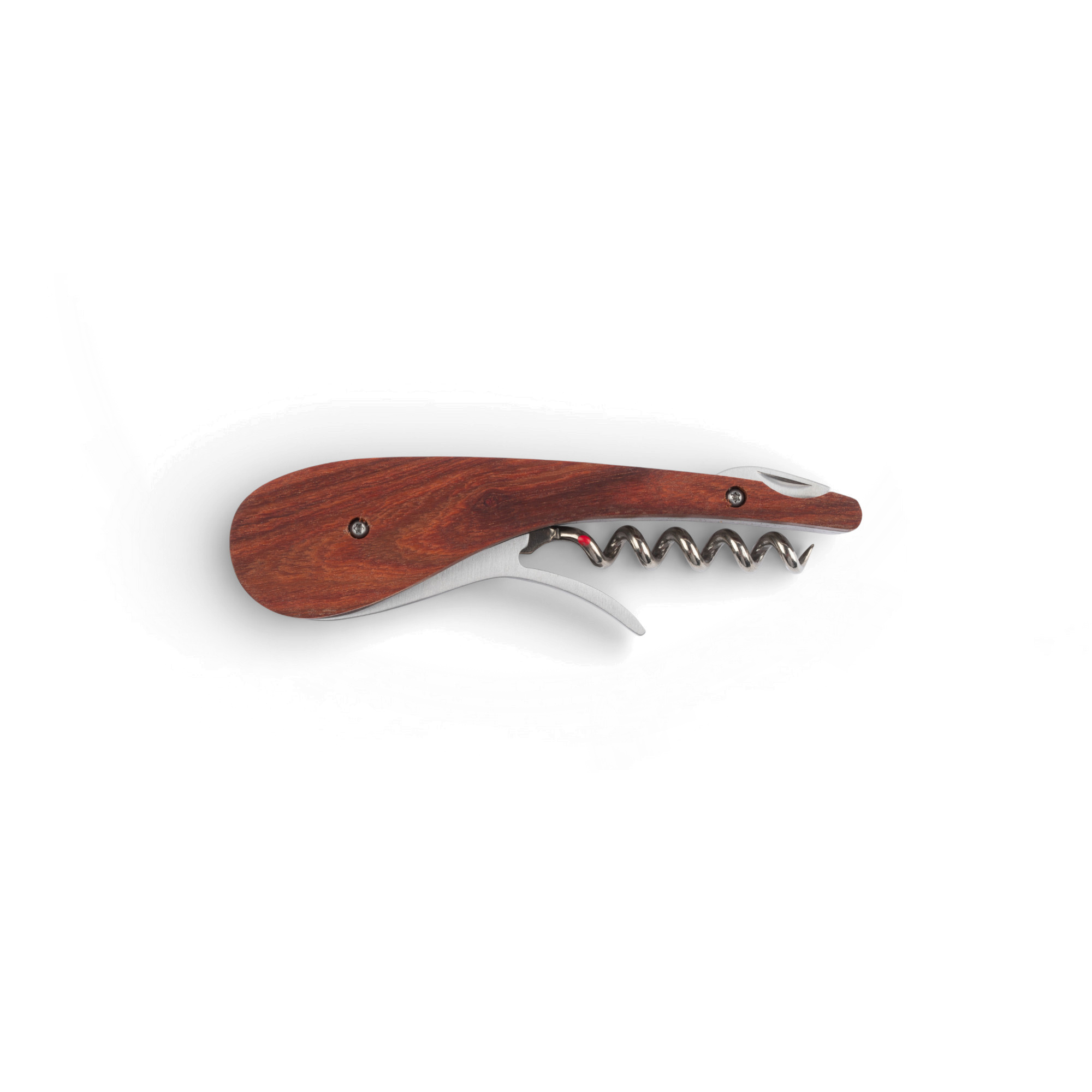 The mechanism is a rack-and-pinion system that pulls the cork straight up in one continuous lift. Use the small foil-cutting wheel built into the handle, set the support arm on the bottle neck, twist until you reach the marker, then lift—clean release, no wrestling. It also includes a bottle opener, comes in a matte black gift box with a protective sleeve, and can be personalized if you want the gift to land.