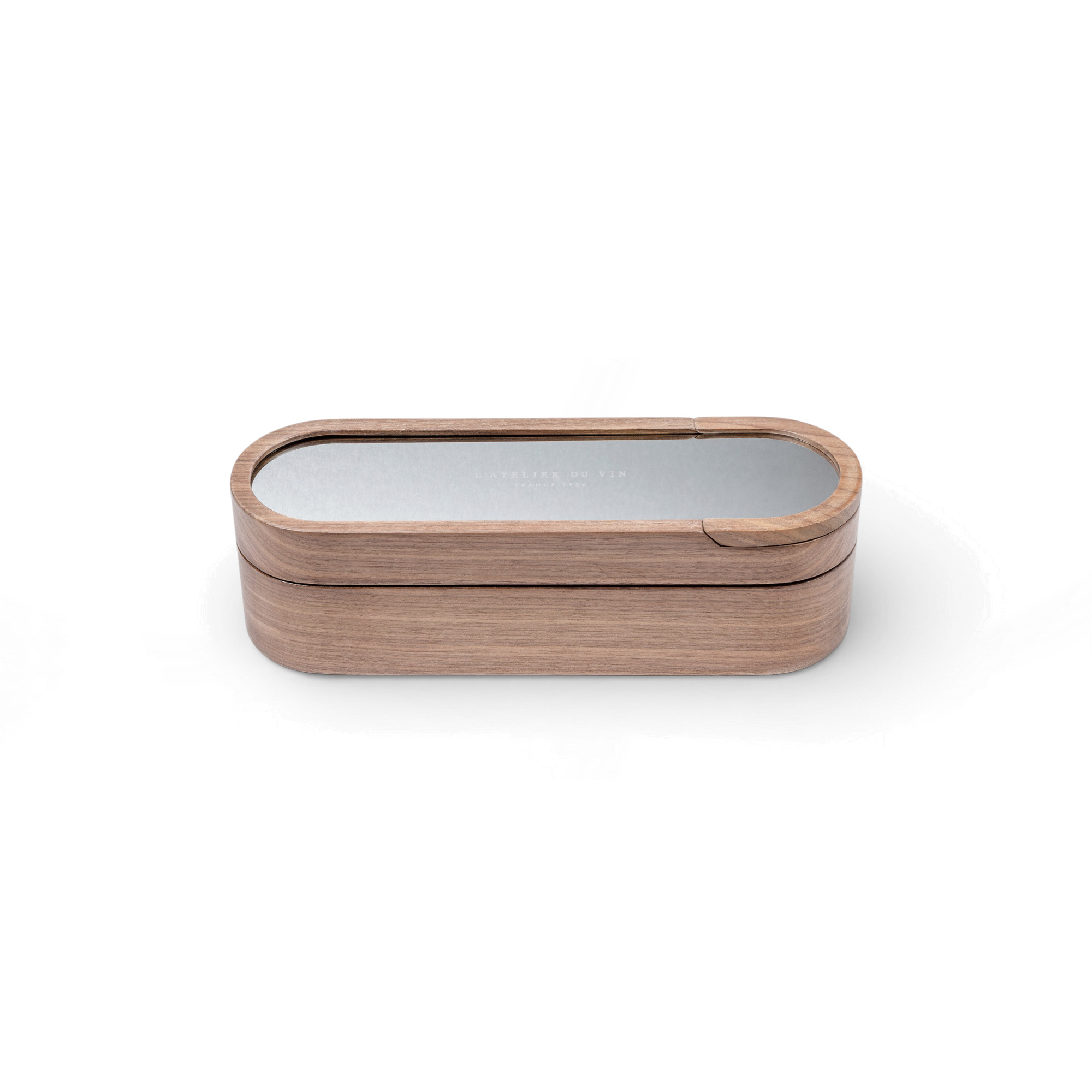Champagne bottle opener set for people who like the opening to feel as good as the first pour. The walnut case slides and pivots with a precise, satisfying motion, revealing a felt-lined interior laid out like a small service kit—plus a dedicated space for capsule tops and other tiny souvenirs from bottles worth remembering.