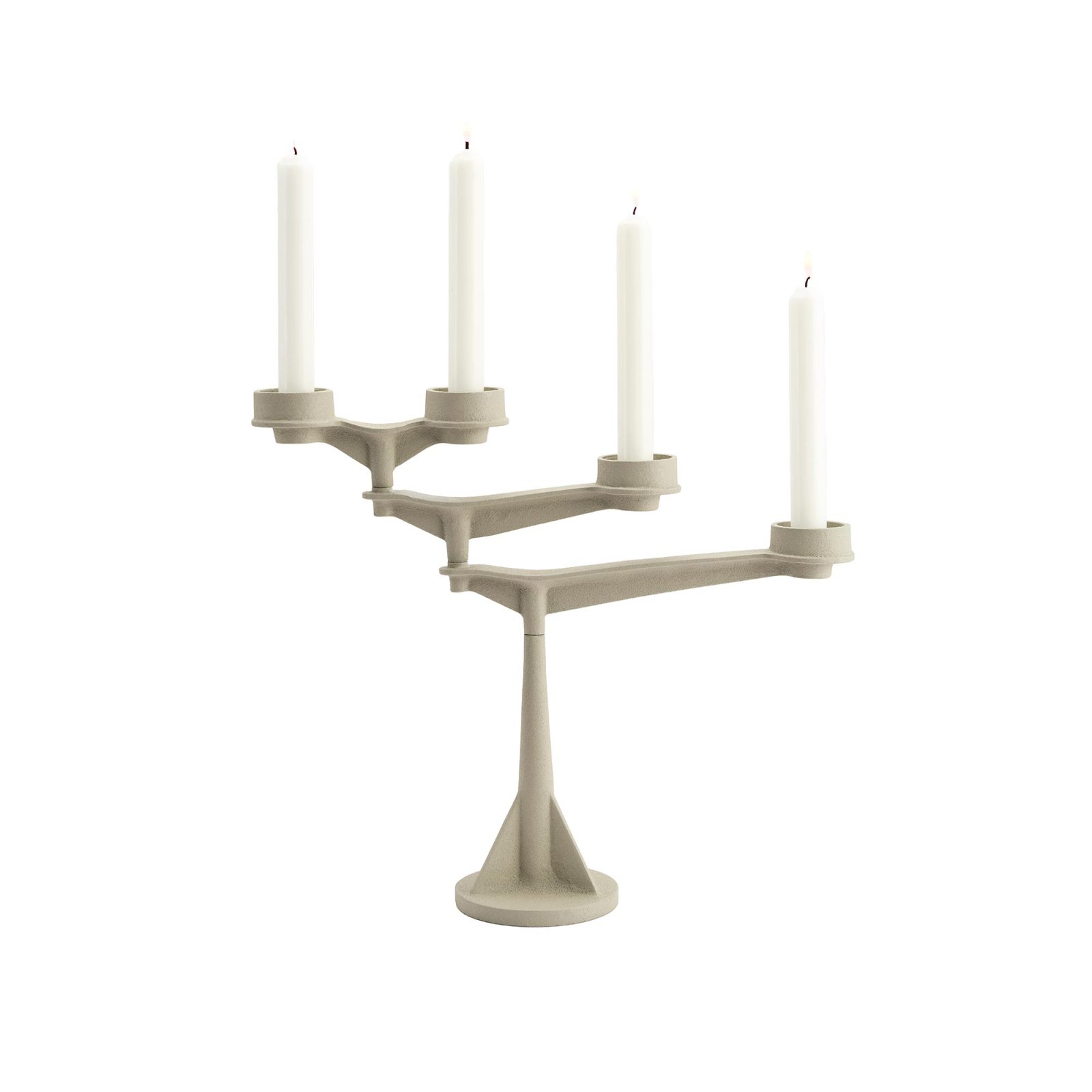 Each head takes a tea light or a taper—the cups are deep and stable, so wax stays put and the flame sits clear of the table. The weight is part of the pleasure: Spin feels planted when you turn the arms, more dockside crane than delicate objet.