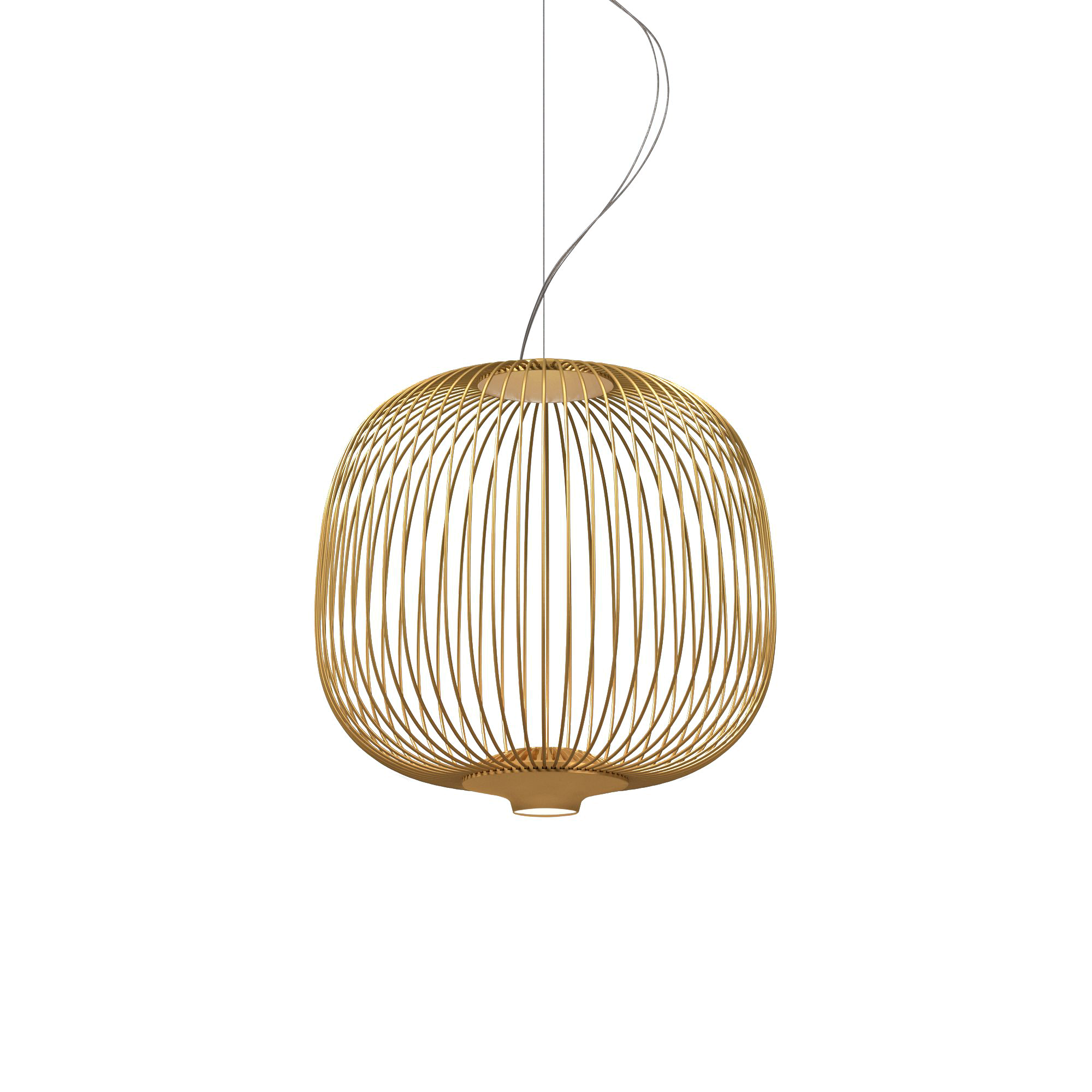 Slender metal ribs trace an airy oval, turning light itself into a pattern of lines that glide across walls and tabletops. This smaller Spokes 2 takes the lantern-like form of the original and scales it for kitchens, bars, or cafés—anywhere you’d tuck a row of fixtures or let a single pendant hover over an intimate table. The LEDs sit hidden inside the lower hub; when they glow, beams slide upward through the spokes, creating a ripple of shadow and brightness while a softer pool gathers below. Choose copper for a warm glint at dusk, graphite for a restrained silhouette, or matte white when you want the glow to do all the talking. Hang one, hang three, mix it with the taller Spokes 1—the open structure keeps every arrangement feeling light and quietly animated.