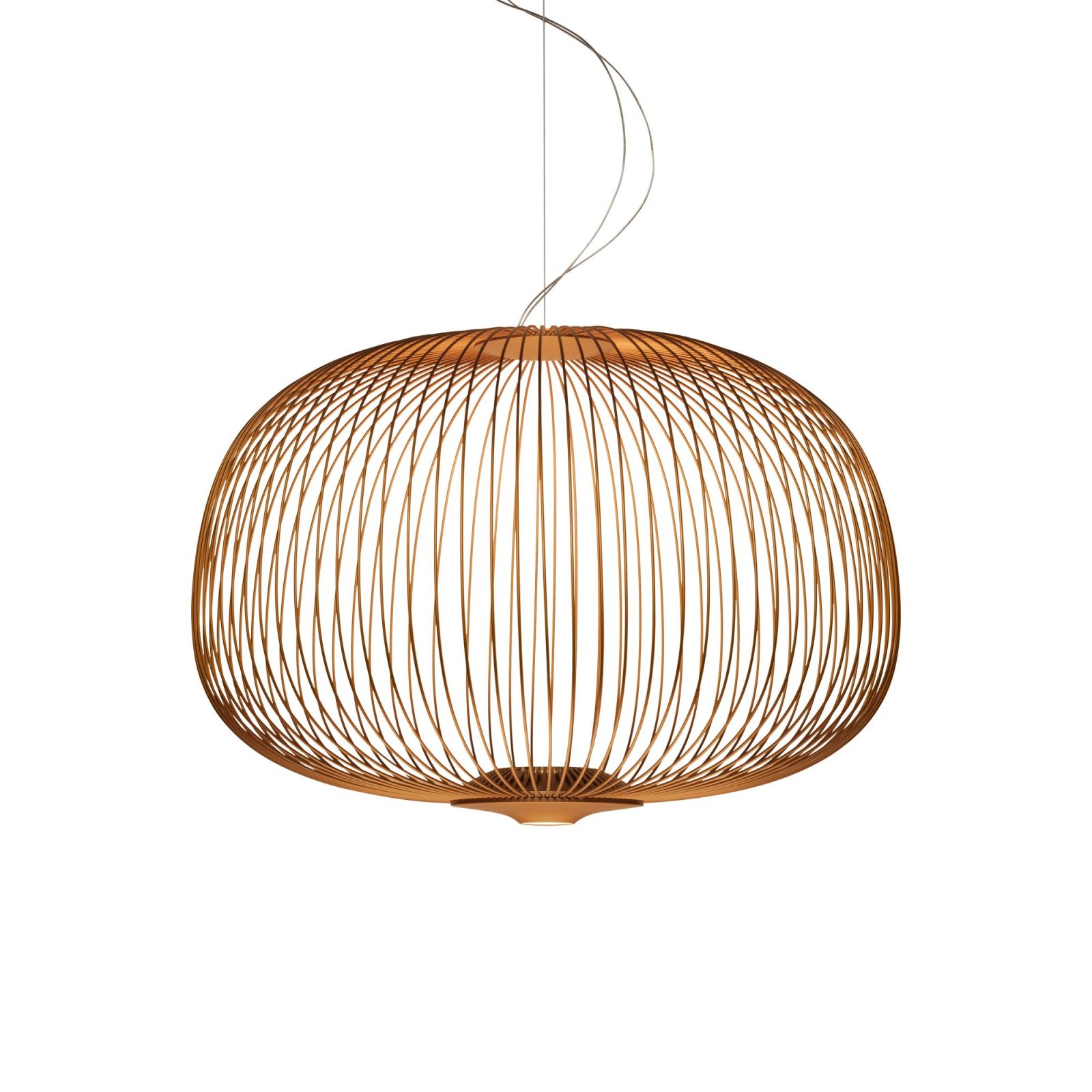 A bicycle wheel, an oriental birdcage, a lantern caught mid-glow—Spokes 3 borrows a little from each. Dozens of matte-varnished steel rods bend into a 24-inch oval (≈ 24 × 16 in) and meet at an aluminum hub that hides a 40 W, 2700 K LED engine. Light spills down in a clean pool, then ricochets through the gaps, striping walls and ceiling with a lattice of shadow.