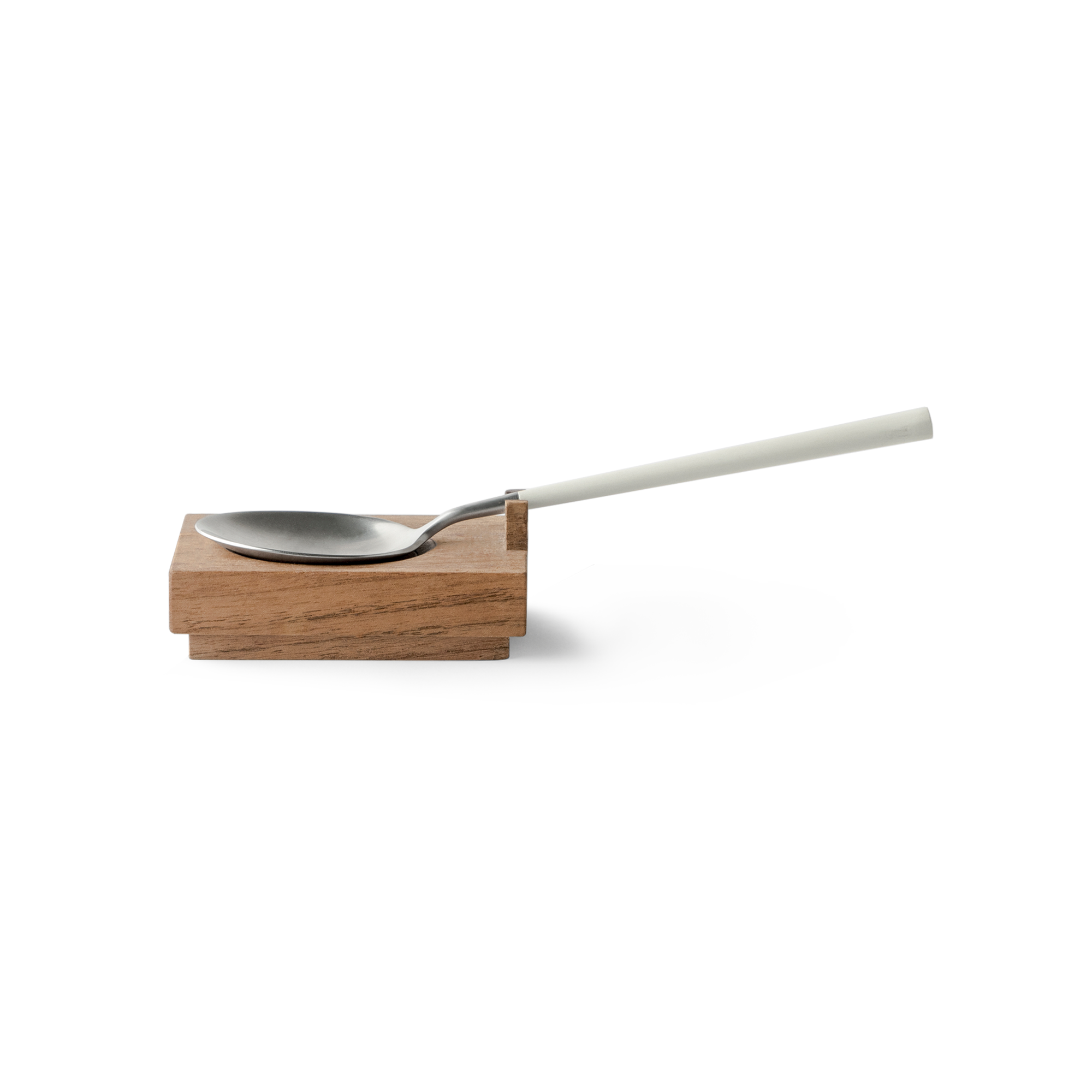 The block has a shallow dish to cradle the spoon bowl and a notch that parks the handle, so the piece arrives steady and goes back down without drips. Wood brings warmth; the spoon’s polished metal keeps flavors neutral and wipes spotless between courses. Set one at each place or line up a few on a board for pass-around tastings.