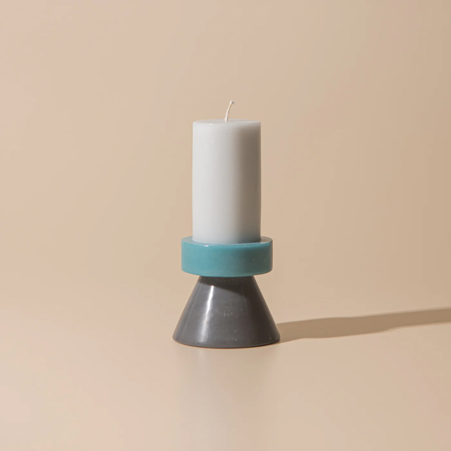 Bright colors and bold geometric forms with clean lines give the classic pillar candles an artistic twist. Part of the Yod and Co collection, the Stack Candle brightens living spaces with its totem-like design. This candle features three different shapes in different colors, all stacked together in a sculptural composition: a conical base, a ring-shaped middle, and a cylindrical top that holds the cotton wick. Chosen with care, the color combinations enhance the eye-catching design further. Individually hand-poured in Indonesia, each candle is one of a kind. Yod and Co works with Fair Trade artisans to produce this collection. The candles are paraffin-free and are made with 100% stearin wax and ecological color dye. The tall version of the Yod and Co Stack Candles has a burning time of 30 hours.