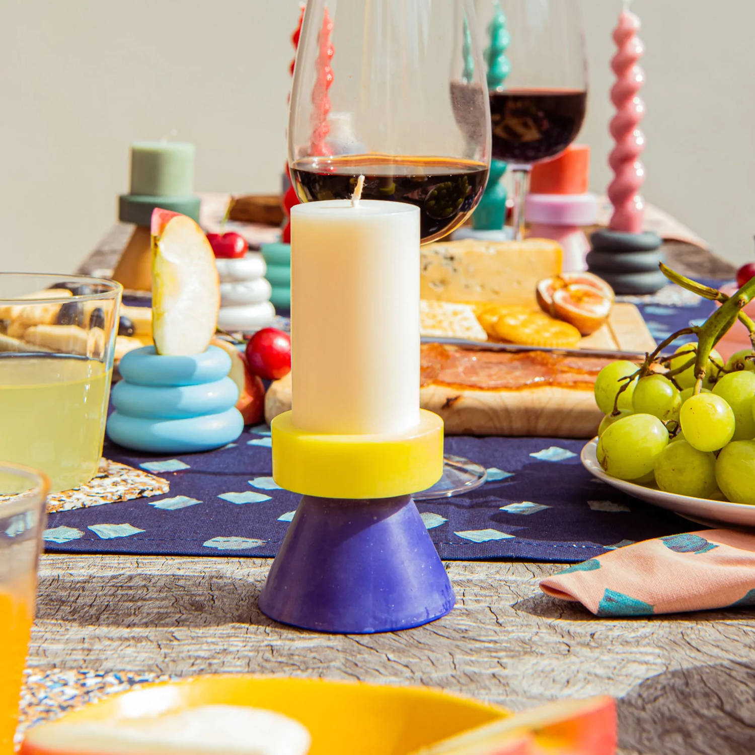 Bright colors and bold geometric forms with clean lines give the classic pillar candles an artistic twist. Part of the Yod and Co collection, the Stack Candle brightens living spaces with its totem-like design. This candle features three different shapes in different colors, all stacked together in a sculptural composition: a conical base, a ring-shaped middle, and a cylindrical top that holds the cotton wick. Chosen with care, the color combinations enhance the eye-catching design further. Individually hand-poured in Indonesia, each candle is one of a kind. Yod and Co works with Fair Trade artisans to produce this collection. The candles are paraffin-free and are made with 100% stearin wax and ecological color dye. The tall version of the Yod and Co Stack Candles has a burning time of 30 hours.