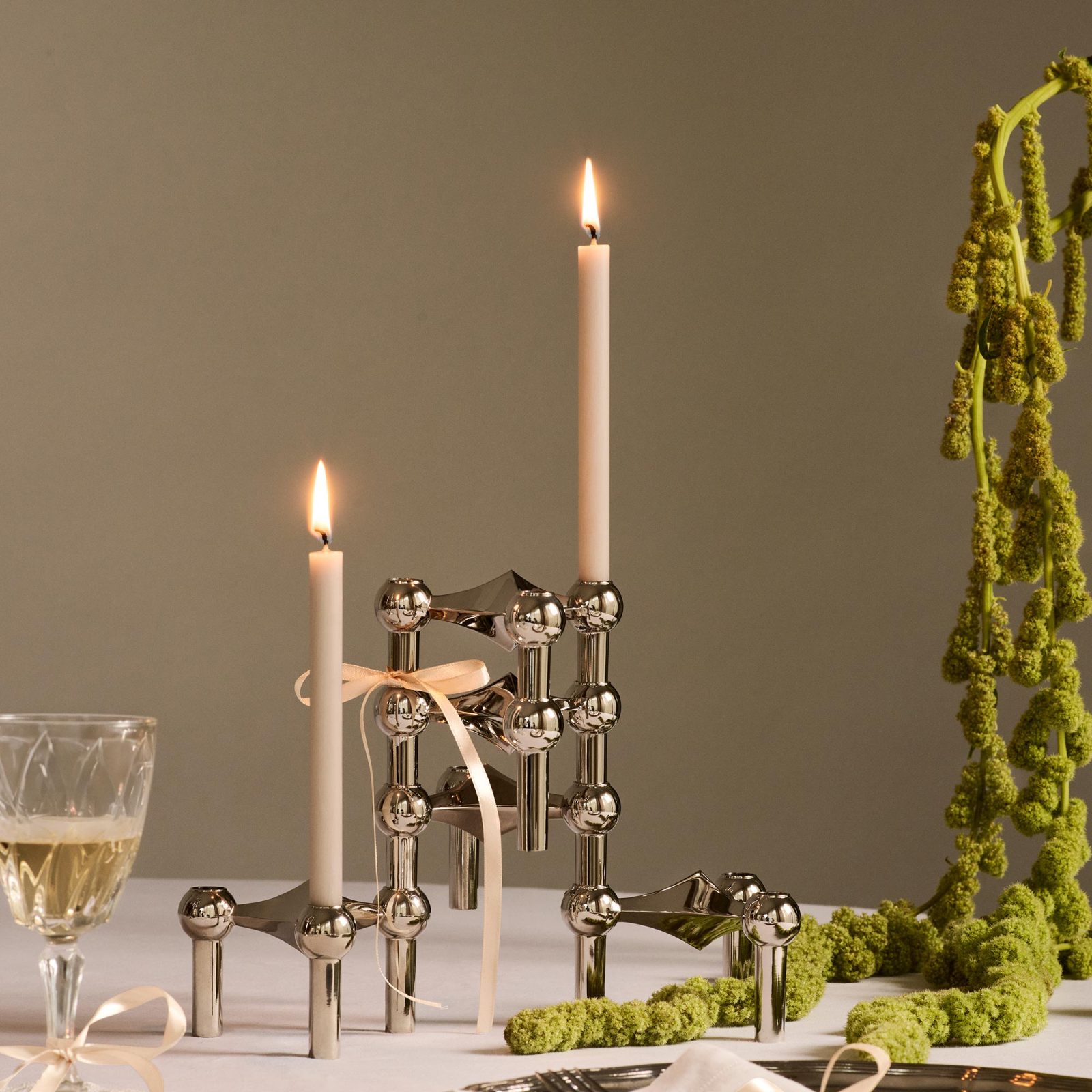 Candles made for the STOFF Nagel holders, sized to fit exactly. They’re mostly paraffin with about 10% beeswax, which slows the burn and gives a faint, natural honey note. One lasts close to three hours — long enough for a meal or an evening with friends.