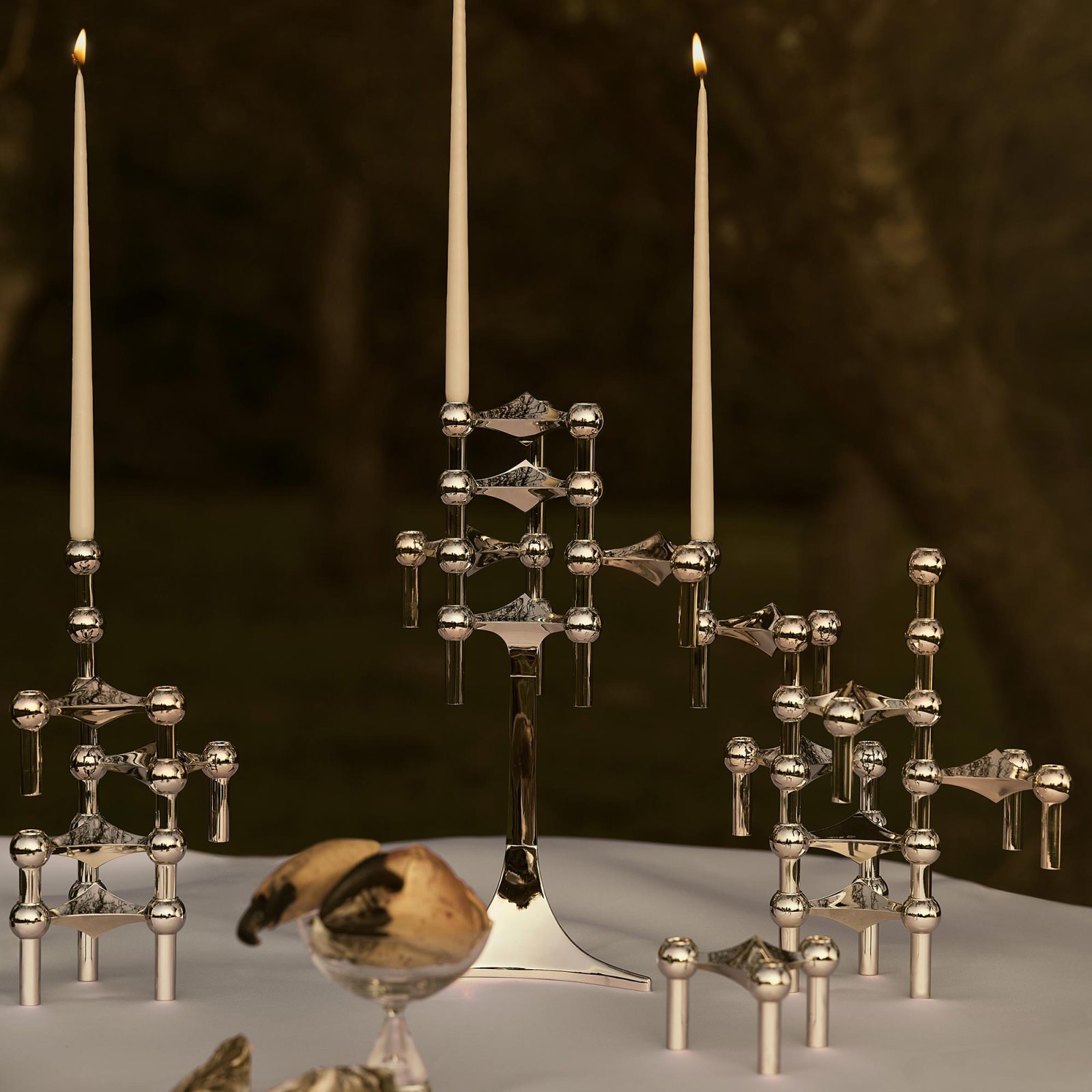 First introduced in the 1960s and reissued today, the stand was designed to anchor the original candle holders, bowls, and vases—adding height and presence to the sculptural combinations. Place a single holder at the top for a minimal look, or build upward into a tall candelabra that shifts with your imagination.