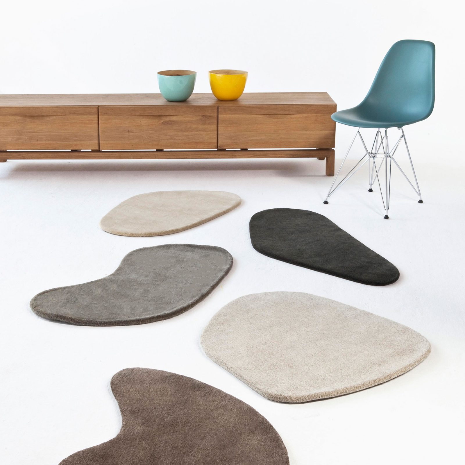 Small rugs with an original design and organic shapes. Stones made of wool; a better option than sticks and stones that hurt one’s bones....