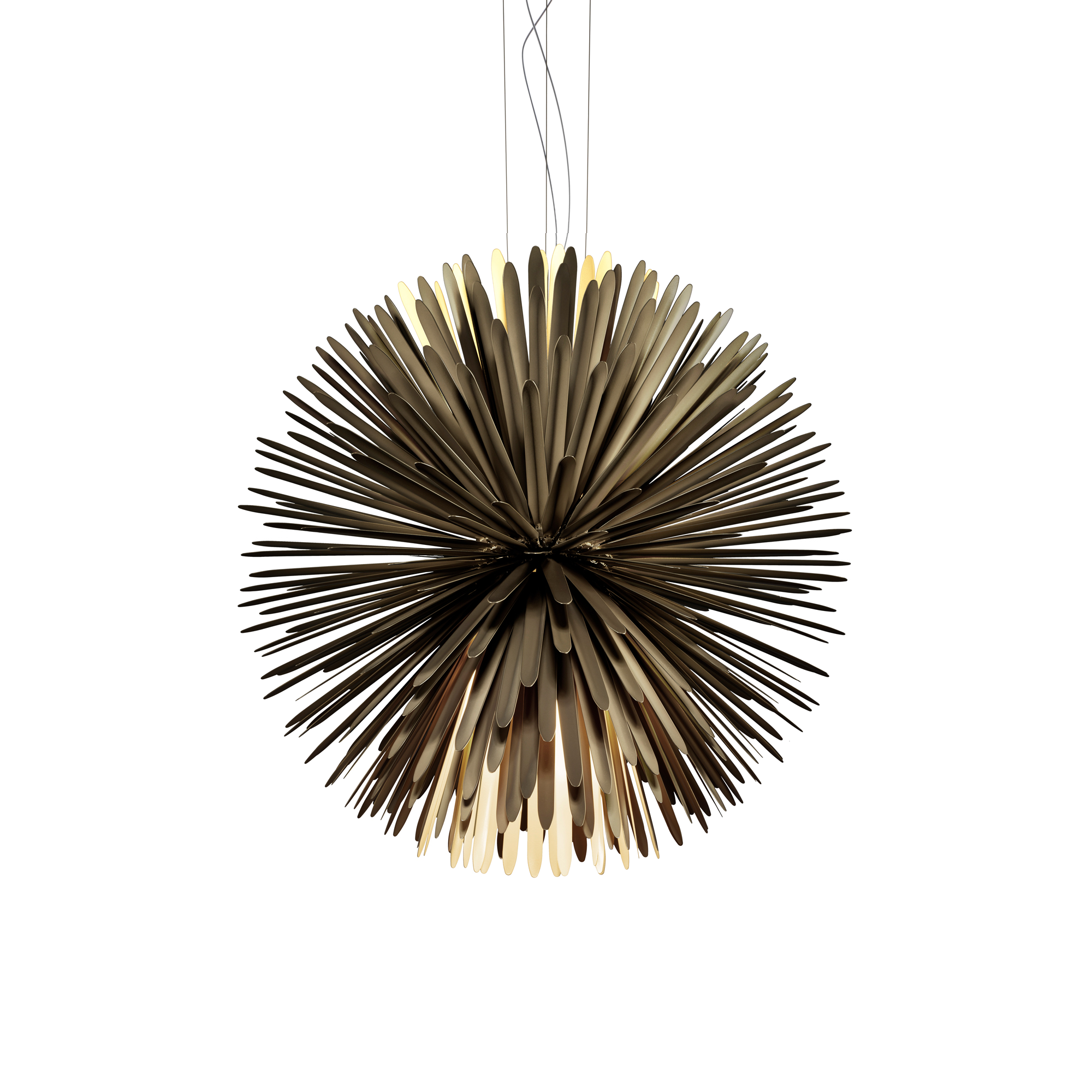 Sun-Light of Love turns metal into a burst of quiet radiance. Dutch designer Tord Boontje arranged dozens of slender aluminum “rays” around a fixed LED core, so the shade reads like a frozen sunflare—no clear inside or outside, just light slipping between petals and scattering soft shadows across the room.