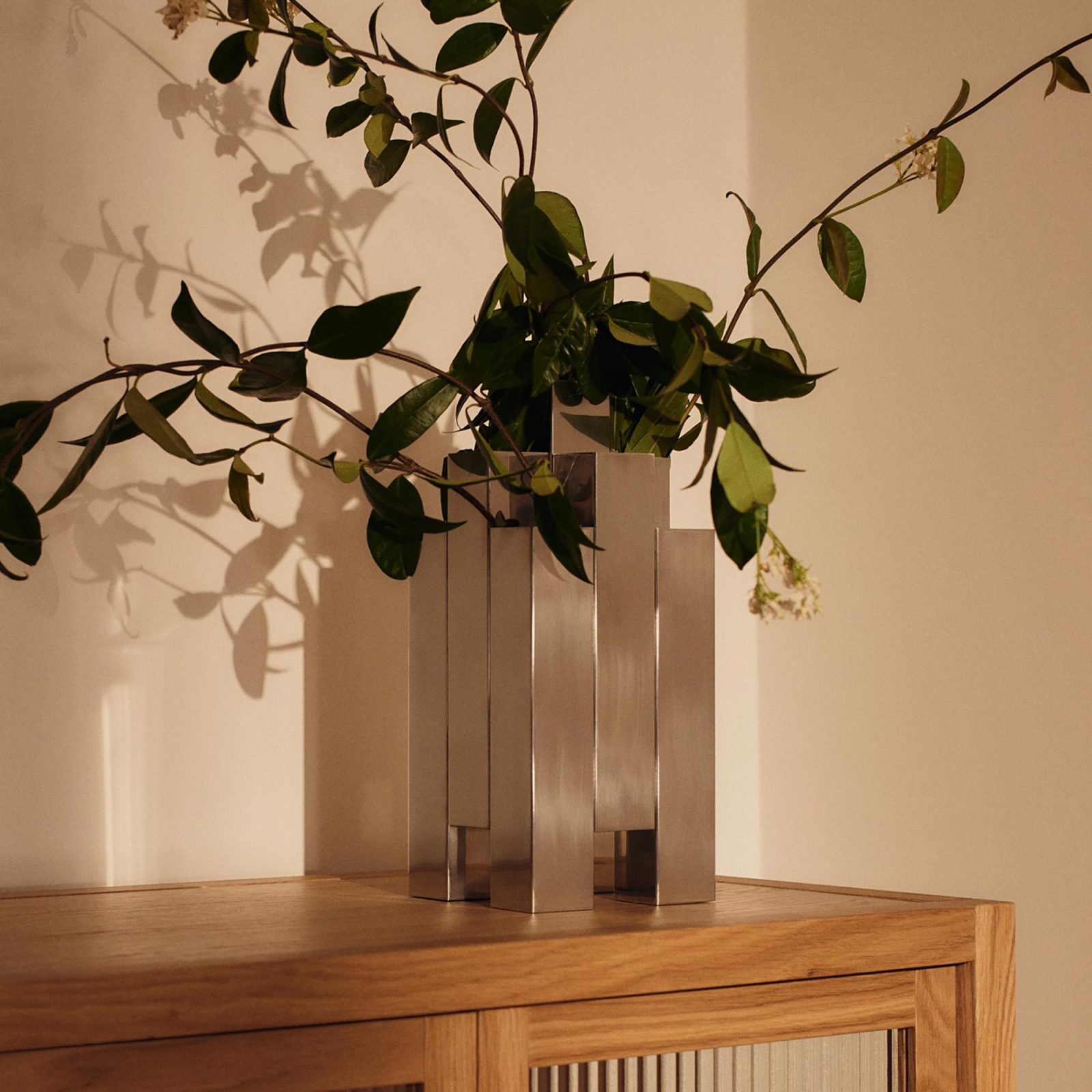 From Ferm Living, the Tessera Vase is a cluster of slim, vertical chambers formed in stainless steel. The polished surfaces read crisp and bright; the stepped heights give arrangements structure without crowding the blooms.