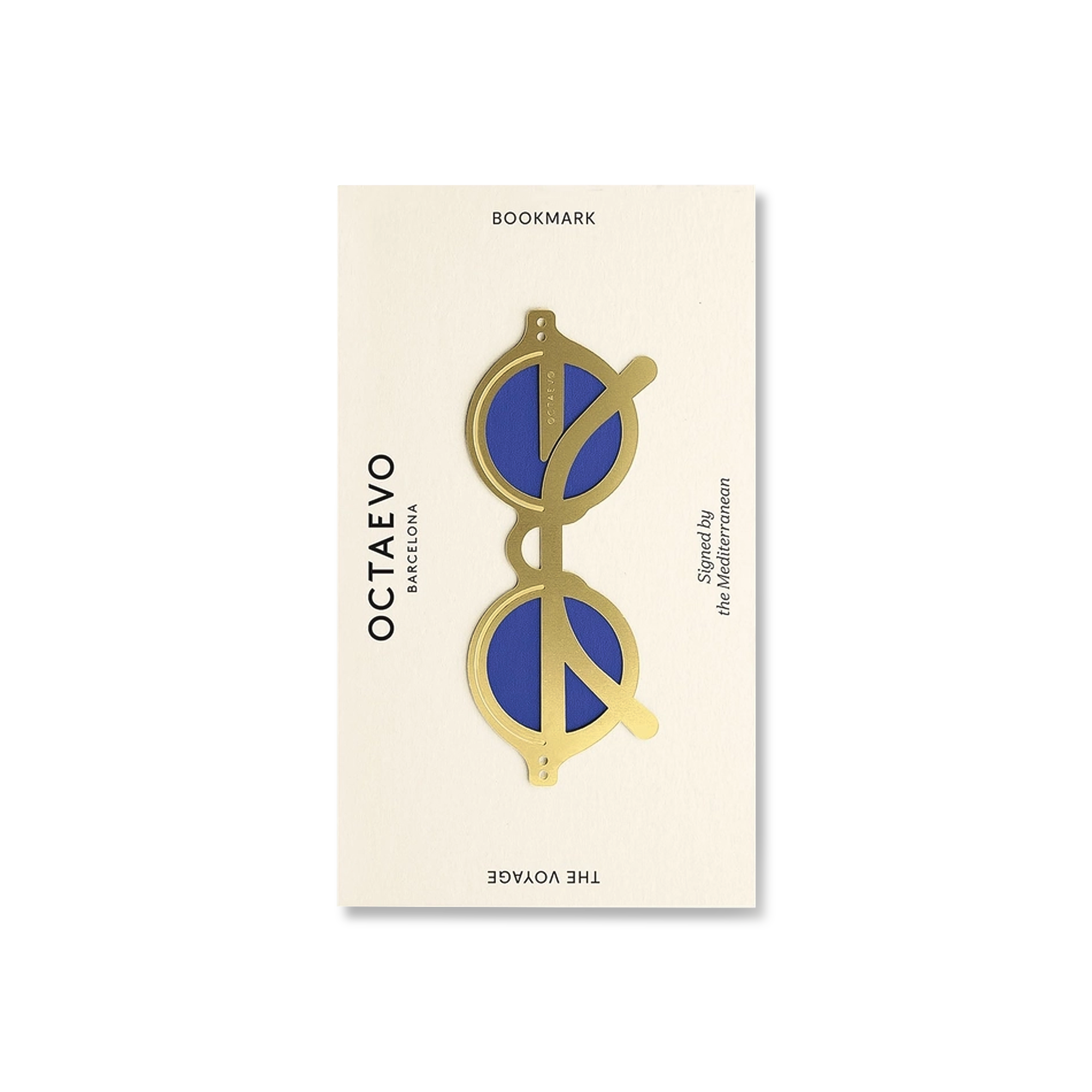The Voyage Bookmark is a slim brass marker with a shape that feels immediately familiar. Two circular forms joined by a narrow bridge give it the look of a small pair of eyeglasses, which makes it easy to recognize and easy to remember. It slips naturally between pages, leaving just enough of itself visible to mark your place without interrupting the book.