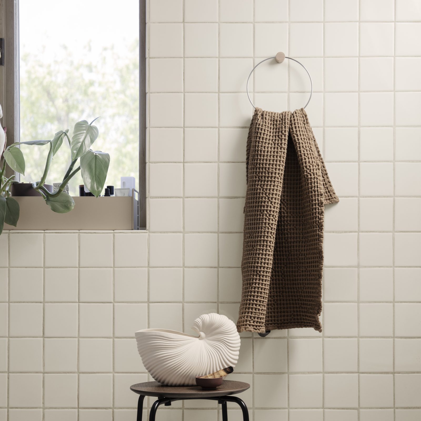 This towel holder brings a simple and classic style to your bathroom, combining a sleek metal ring with a wooden hook that also serves as the wall mounting. The design allows for effortless elegance, as a towel drapes casually over the metal ring. It integrates seamlessly into any bathroom decor, adding a touch of understated sophistication. The holder comes complete with a screw and rawlplug for easy installation.