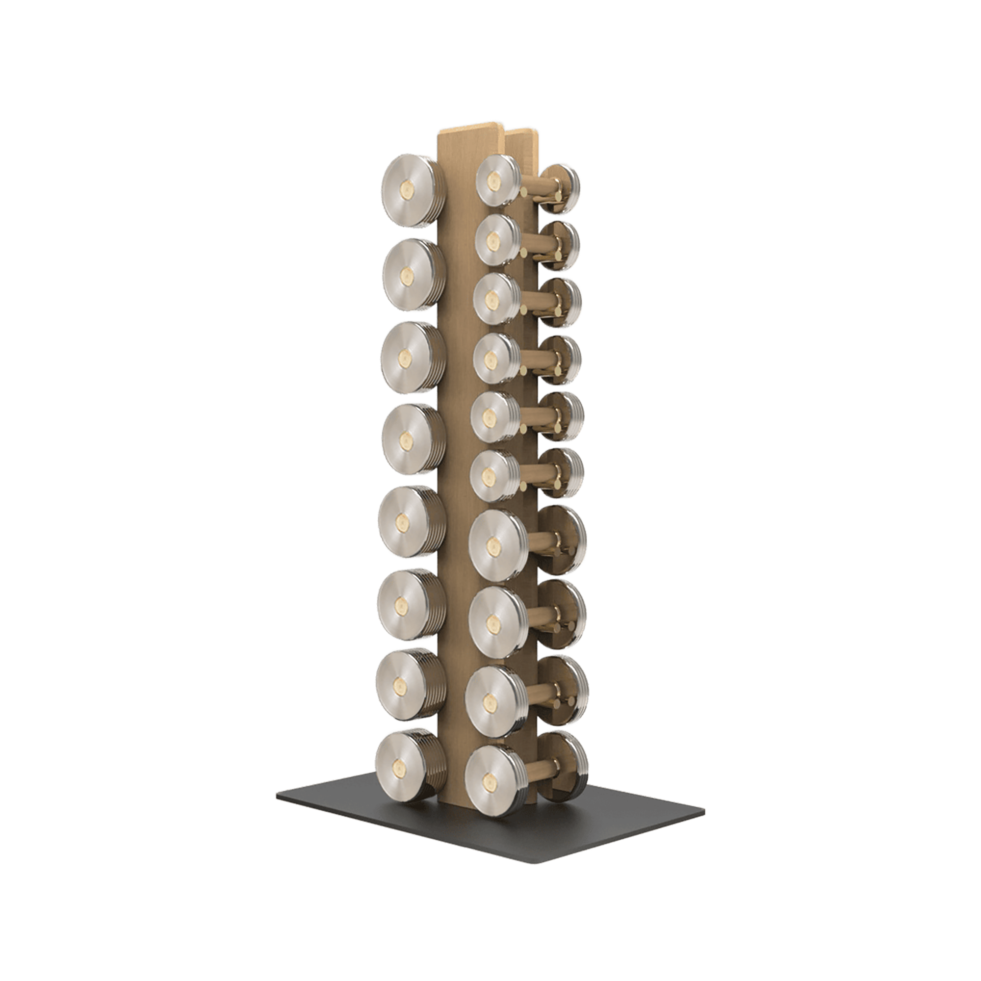 Standing no wider than a shoebox, the vertical layout frees floor space while turning your weight range into a column of reflective discs. Rubberised sleeves protect the wood, silent felt buffers prevent clangs, and the weighted base resists tipping even when the top tier is empty.