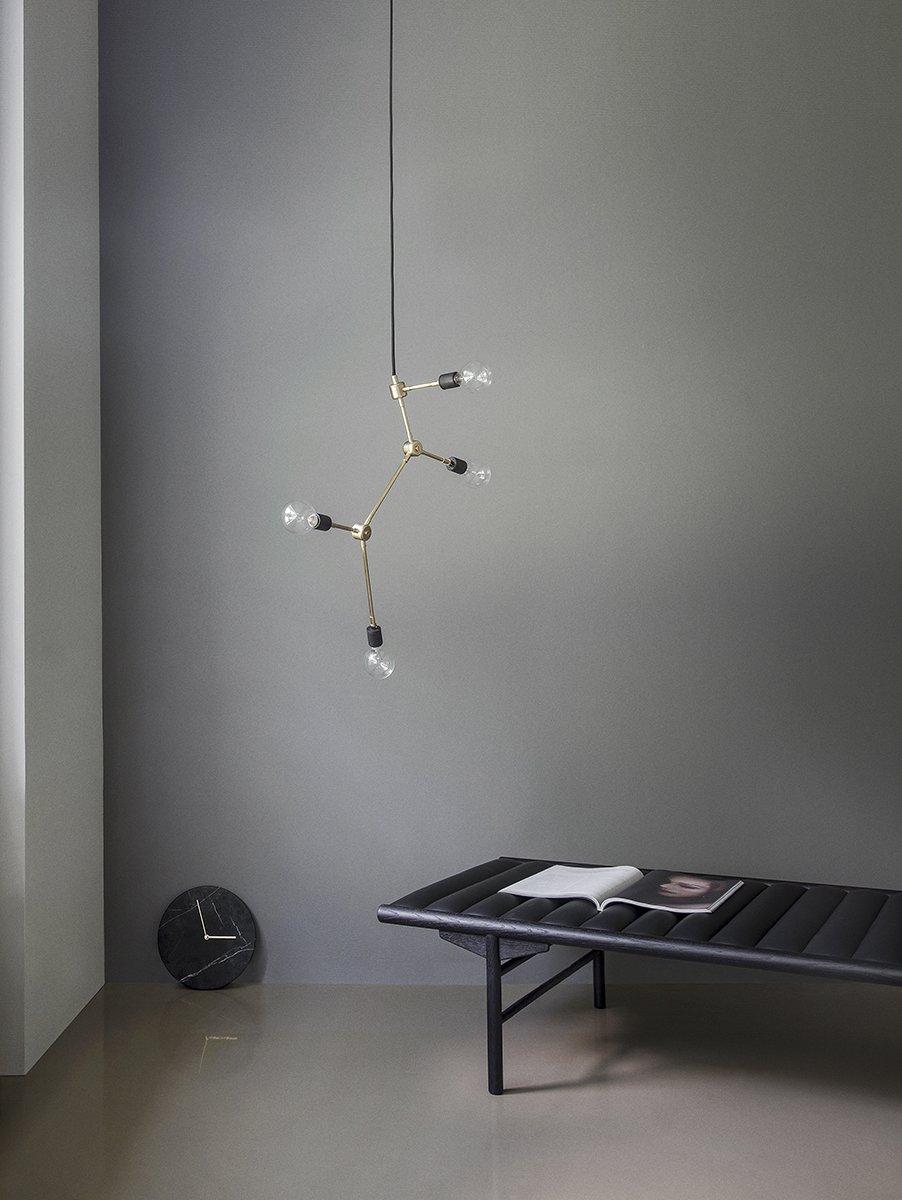 The Franklin Chandelier is part of the city-inspired Tribeca series by the Dutch designer Søren Rose. Paying homage to one of New York’s most high-end neighborhoods, the series makes use of salvaged lamp parts and echoes the glamor of 1930s Manhattan. The Franklin Chandelier in particular refers to the Franklin Street, a bustling site of urban activity. The contemporary lighting design illuminates the room from all angles, as its four exposed bulbs are angled in a constellation. Industrial chic through and through, the suspended lamp pairs classic porcelain sockets with one’s choice of a shining brass or matte black steel frame.