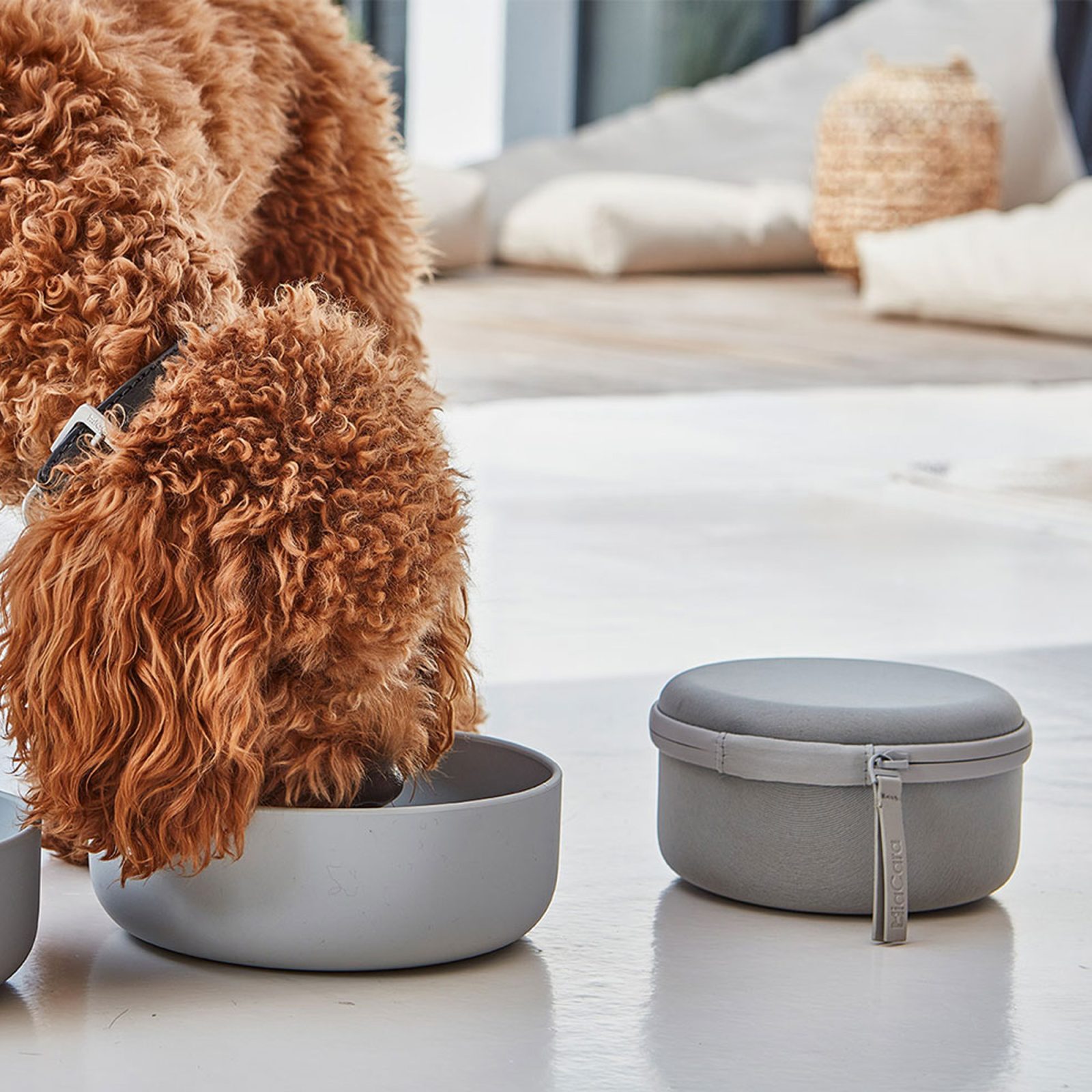 Traveling with a pet should be fun and not stressful. The MiaCara Vacanza Weekender Bag comes to the rescue to make every trip easier to plan. The ideal weekender bag for people with pets, this design optimizes function without sacrificing style. It features a minimalist design with a dark gray fabric, elastic straps, a monochrome nylon webbing strap, and matte hardware. Plus, it’s mostly crafted from 100% recycled PET, making this bag one of the greenest you can find. The material is easy to wipe clean, both inside and out, and it’s water repellent and extra durable. Inside, pockets with elastic straps can hold a water bottle, toys, and treat bags, while the main compartment can easily accommodate bowls like the Bento set. A separate waterproof compartment provides a convenient way to store used toys and wet bowls.