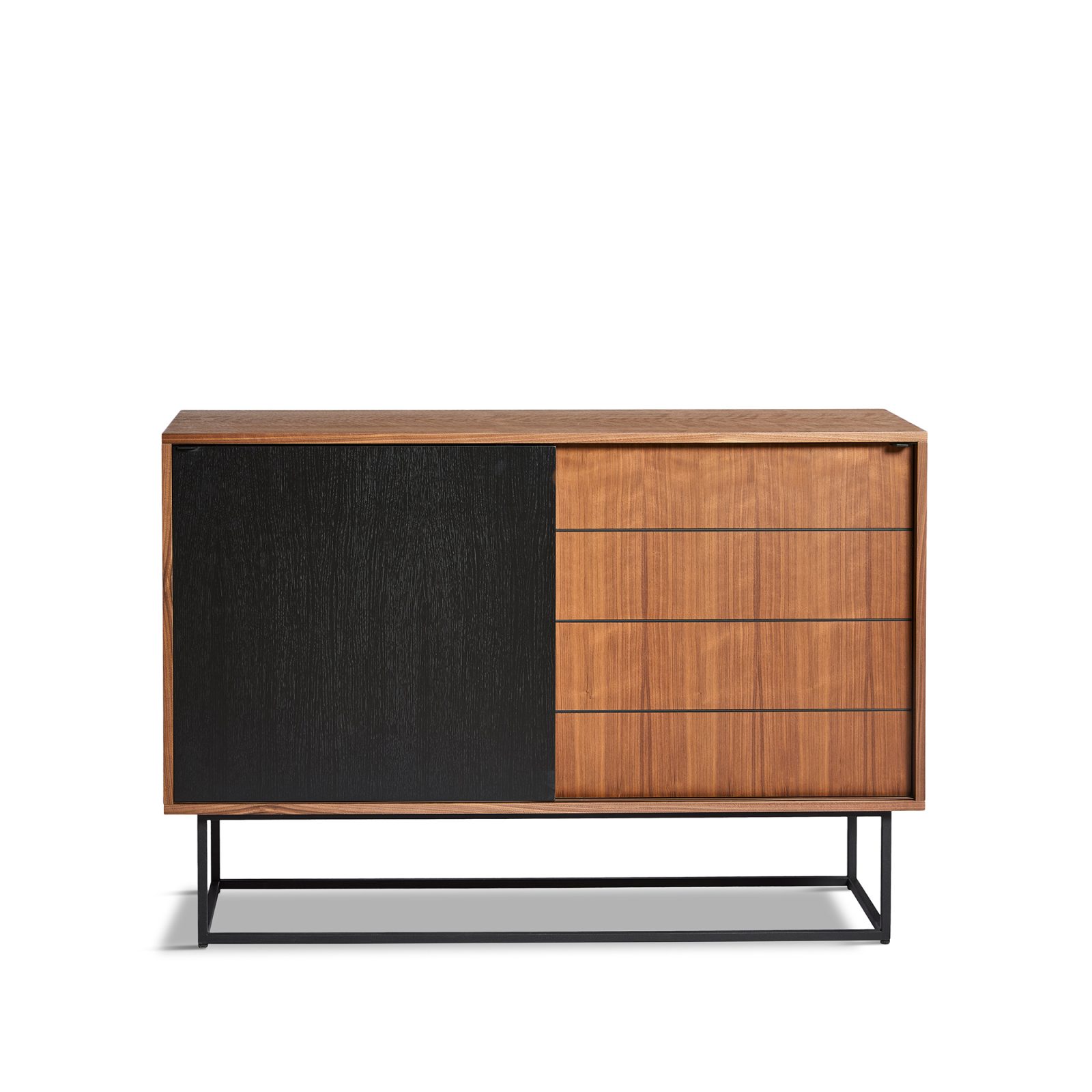 Lightness and solidity create an elegant dialogue with each other in the Virka collection of modern sideboards. Designed in a collaboration between MOAAK and Røpke Design, the Woud Virka Sideboard makes storage beautiful and timeless. It features a slender geometrical frame that complements the hefty walnut volume. Sliding doors optimize function and available space while adjustable shelves and two cable holes at the back provide an easy way to organize the interior to suit your needs. This version of the Virka sideboard features a walnut and black metal frame, with one door also painted black. It comes fully assembled and has adjustable feet to remain perfectly stable on uneven flooring surfaces. A low level version of this design is also available.