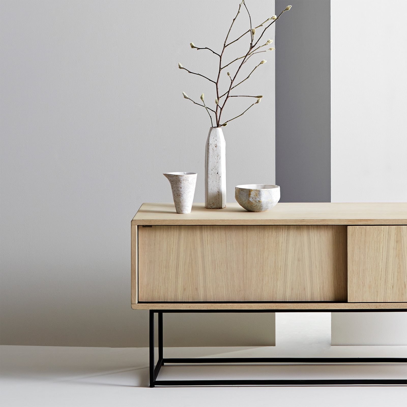Embrace your dark side, at least when it comes to interior design, with the Woud Virka Sideboard Low Black. Minimalist yet bold thanks to an intense black finish, this oak and metal sideboard doubles as a décor enhancement. Danish designers Mark Wedel and Rasmus Røpke used their creative talents to devise the Virka collection, resulting in a gorgeous series of low and high cabinets that offer the perfect synthesis between function and minimalist design. This version features a monochrome, all-black finish, but the same sliding doors, adjustable shelves, and handy openings at the back for cables. Great in living rooms and dining rooms in equal measure, the Woud Virka Sideboard Low Black comes fully assembled.