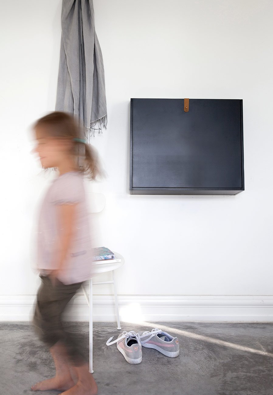 Designed as a multi-functional object, the Wall Desk offers a modern take on the traditional bureau desk. Just like its inspiration, this desk fulfills various functions in a convenient unitary design. From storage space to work station and display area, the Wall Desk can suit any need and it transforms into a contemporary geometrical decor piece when not in use, by closing it with the brown leather and metal fastener. Inside, there’s a storage shelf and built-in cable access. The practical Wall Desk is made from wood, metal and leather. It can be installed in any room in your home, adding more functionality to your living space.