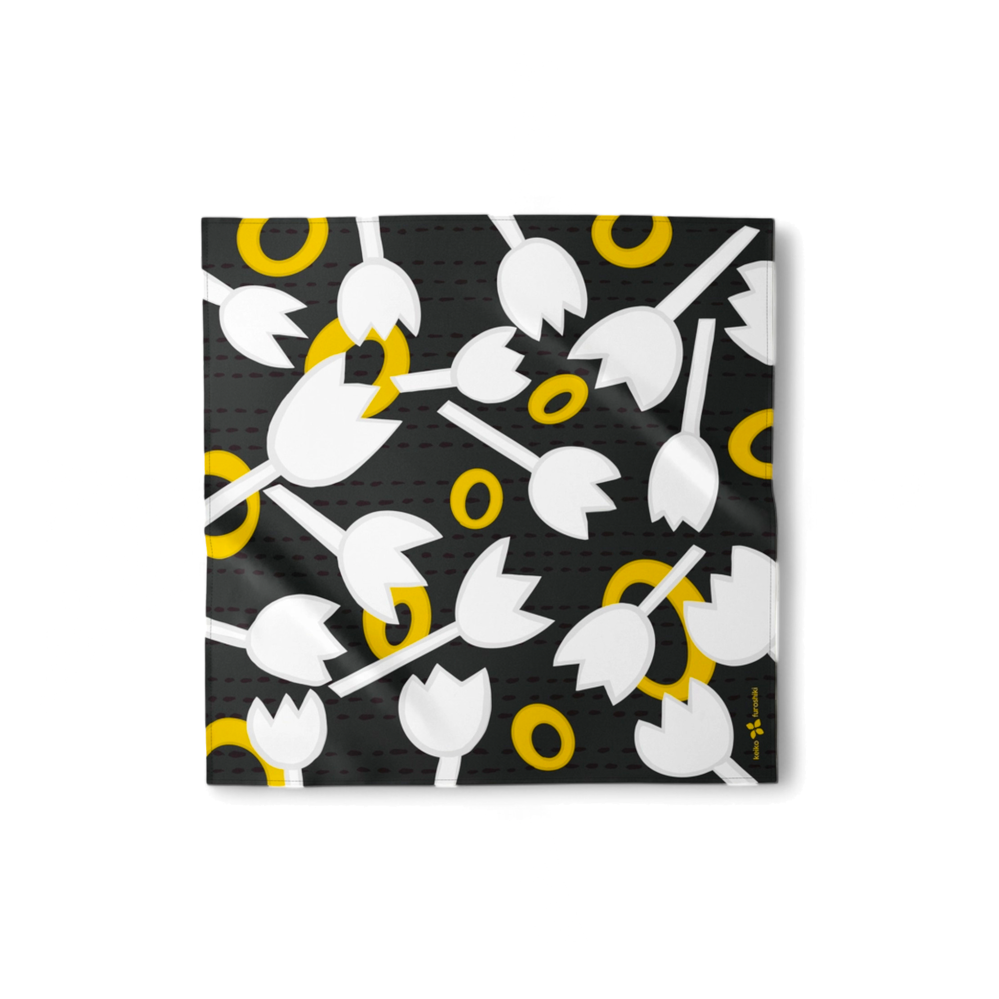 This furoshiki plays with contrast and rhythm, scattering stylized white tulips across a black background with dotted lines and bright yellow rings. The oversized graphic shapes feel joyful and graphic, perfect for wrapping gifts with a twist or using as a fashion accent. It’s bold, fun, and undeniably expressive.